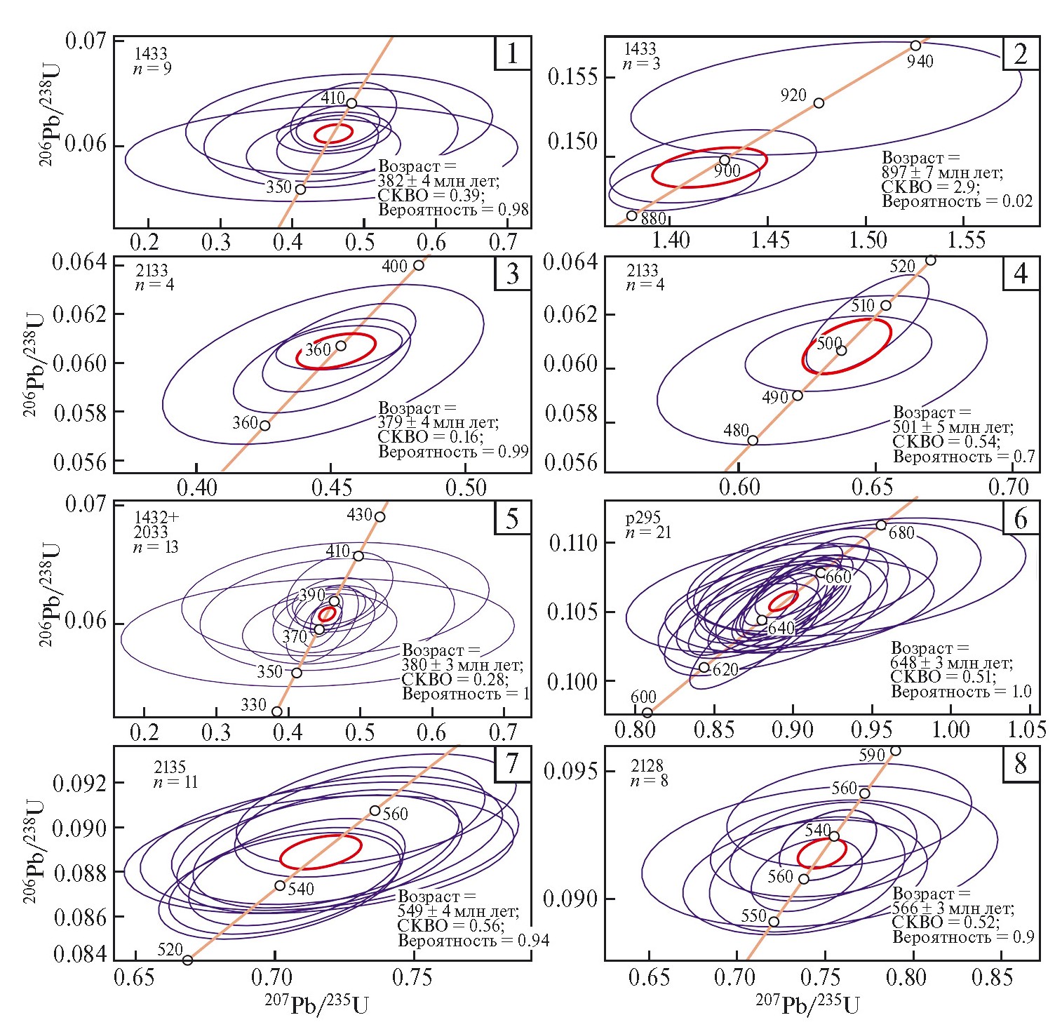 Рис. 4. Диаграммы с конкордией для циркона пород максютовского комплекса. 1–2 – проба 1433, эклогиты Шубинского месторождения, метаморфический циркон (1), магматический циркон (2); 3–4 – проба 2133 – гранат-омфацитовые породы, метаморфический циркон (3), магматический циркон (4); 5 – пробы 1433 и 2133 совмещенные, метаморфический циркон; 6 – проба р295, мусковит-альбит- глаукофан-цоизит- гранатовые сланцы; 7 – проба 2135, мусковит-амфибол-альбитовые сланцы; 8 – проба 2128, амфибол-альбитовые сланцы.