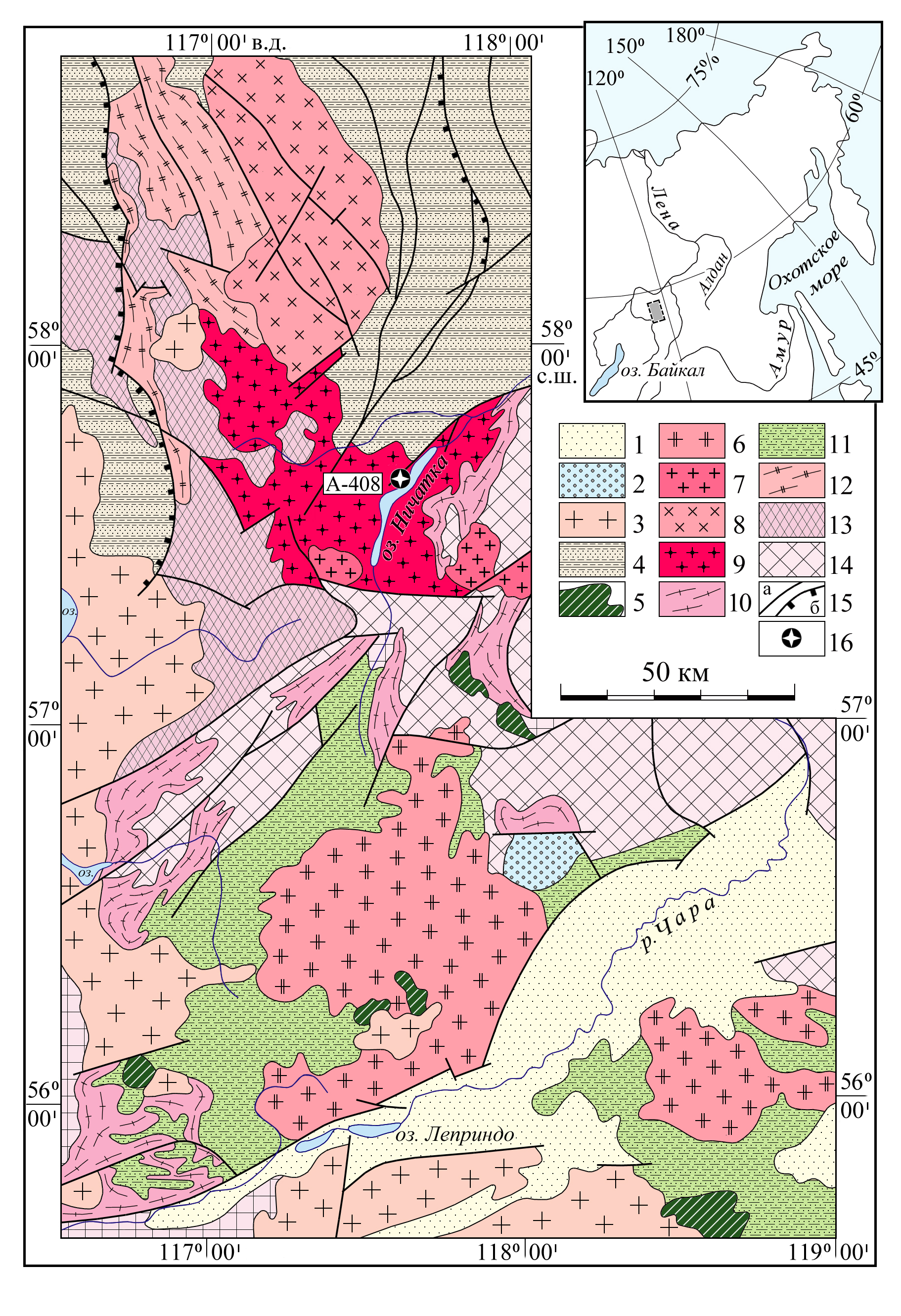 Рис. 1. Схема геологического строения зоны сочленения Чара-Олекминского геоблока Алданского щита и Нечерского поднятия Байкальской складчатой области. Составлена Л. Б. Макарьевым. 1 – четвертичные отложения; 2 – юрские отложения наложенных впадин; 3 – палеозойские граниты; 4 – неопротерозойские толщи патомской серии; 5–11 – палеопротерозойские породы: 5 – расслоенные мафит-ультрамафитовые интрузии чинейского комлекса, 6–10 – гранитоидные комплексы: 6 – кодарский, 7 – березовский, 8 – ченчинский, 9 – ничатский, 10 – куандинский, 11 – метаосадочные породы кодарской серии удоканского комплекса; 12–13 – раннедокембрийские нерасчлененные комплексы Нечерского поднятия: 12 – граниты, гнейсограниты, 13 – гнейсограниты, мигматиты, гранулиты и кристаллические сланцы; 14 – архейские тоналиты, гнейсограниты, чарнокиты, эндербиты и кристаллические сланцы Чара-Олекминского геоблока; 15 – главные разломы (а) и надвиги (б); 16 – место отбора пробы для геохронологических исследований.