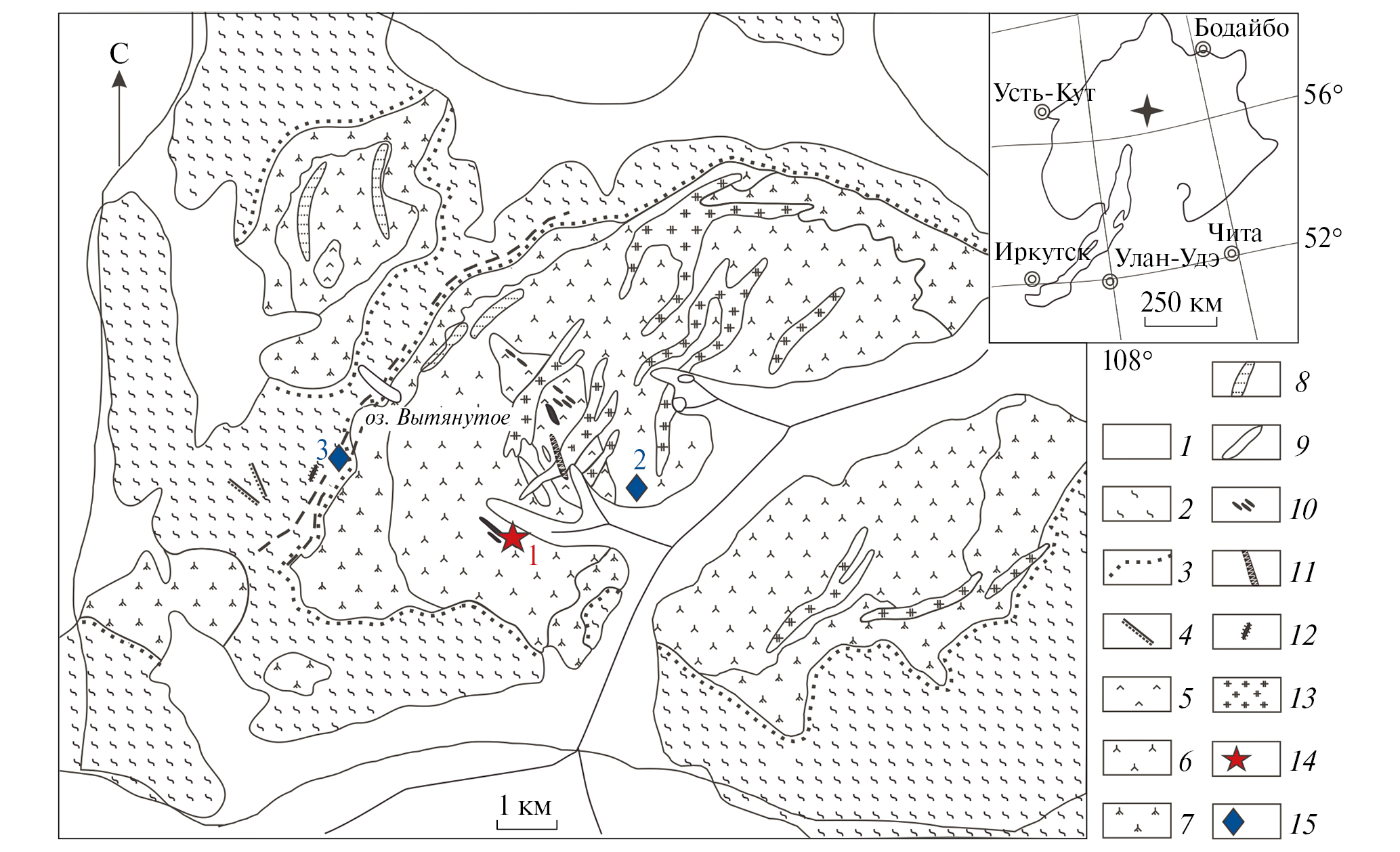 Рис. 1. Схематическая геологическая карта Бурпалинского массива. 1 – четвертичные отложения; 2 – песчаники, алевролиты холоднинской свиты; 3 – роговики; 4 – шонкиниты; 5 – нефелиновые сиениты; 6 – полосчатые трахитоидные сиениты; 7 – кварцевые сиениты; 8 – мариуполиты; 9 – фойяиты; 10 – редкометалльные пегматиты; 11 – апатит-флюоритовая жила; 12 – карбонатиты; 13 – щелочные граниты; 14 – место отбора проб для геохронологических Th‒U–Pb-исследований по монациту (1-Бур 310/9); 15 – места отбора проб для U‒Pb-геохронологических исследований по циркону (2 – проба Бур 305/10, 3 – проба Бур 313/10 [2, 3]).