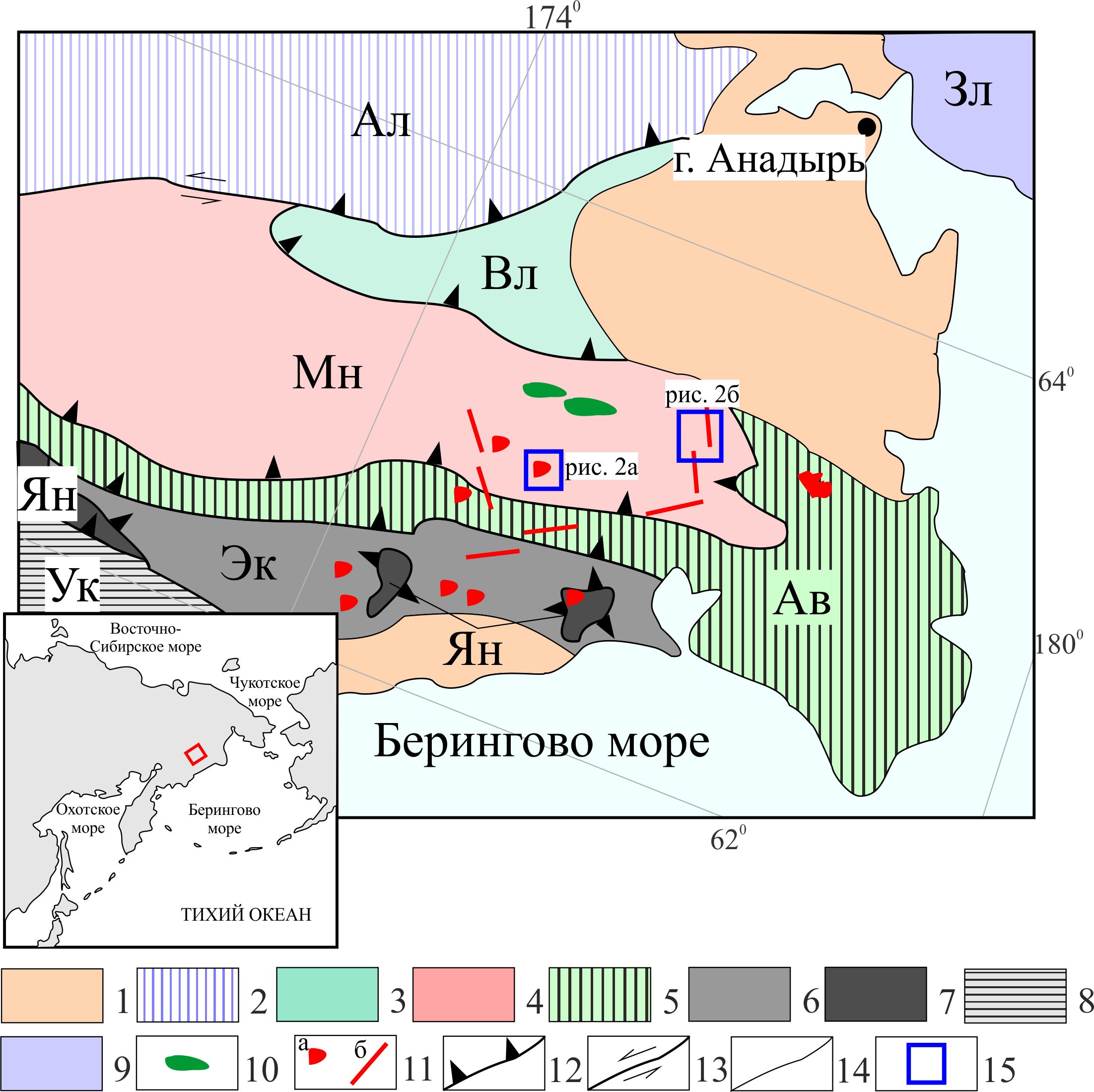 Корякская складчатая область представляет собой крупное аккреционное покровно-складчатое сооружение Тихоокеанского пояса. В ее пределах структурно-формационные комплексы среднего палеозоя – палеогена объединены в покровы, шарьированные в южном направлении. В южной части области нижнее структурное положение занимает Эконайская система покровов. Она включает комплексы Янранайского и Эконайского террейнов. Время становления Эконайских покровов определяется как домаастрихтское, исходя из возраста неовтохтона. Структурно выше расположена Корякская система покровов, которая включает комплексы Майницкого и Алькатваамского террейнов и была сформирована на рубеже мела–палеогена [6, 11].