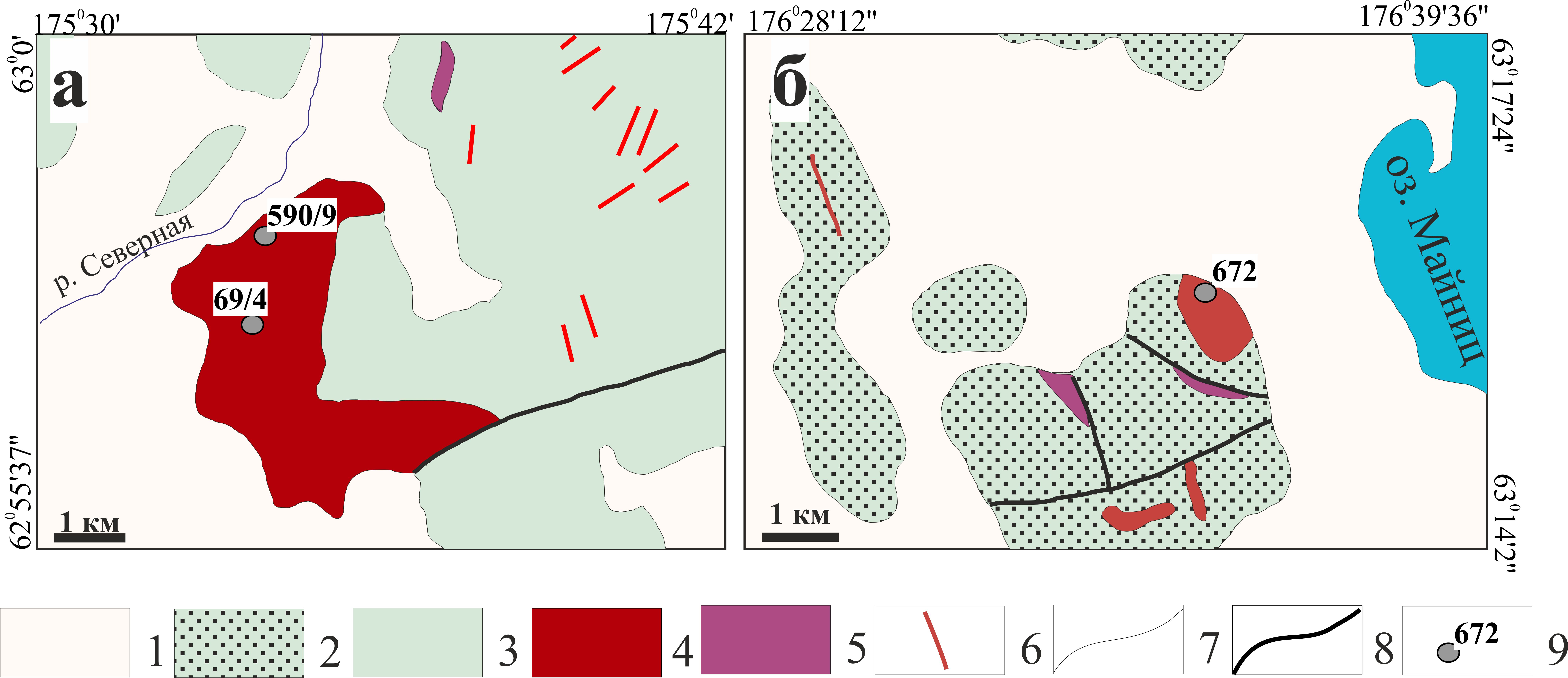 Рис. 2. Схемы геологического строения районов р. Северная (а), оз. Майниц (б) Майницкого террейна, по [1, 3‒5] с изменениями. 1 – четвертичные отложения; 2, 3 – терригенные и вулканогенно-терригенные отложения: 2 – келловей-готерив, тополевская толща; 3 – альб–турон, куйбивеемская серия; 4 – штоки плагиогранитов и гранодиоритов; 5 – диоритовые порфириты; 6 – дайки гранитоидов; 7 – геологические границы; 8 – разломы; 9 – места отбора геохронологических проб и их номера.