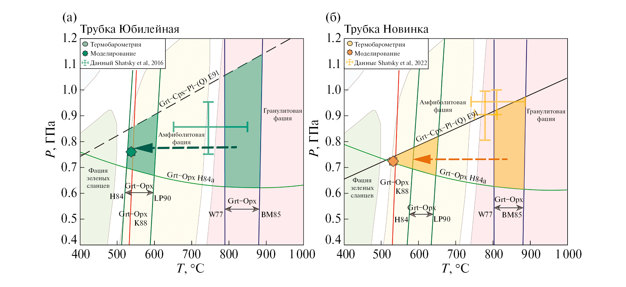 Рис. 4. P-T условия образования гранулитов из трубок Юбилейная (ЮБ‑19–05) (a) и Новинка (Н‑19-44) (б) методами геотермобарометрии и моделирования фазовых равновесий. Использованные минеральные равновесия: Grt– Cpx- (красная линия), Grt–Opx- (зеленые линии), Cpx–Opx- (синие линии) геотермометры и Grt–Opx- (светло-зеленая линия), Grt–Cpx–Pl–Q- (черные линии) барометры для средних составов краевых частей минералов. Зеленым и желтым выделены поля установленных P-T условий. Стрелки – предполагаемые P-T тренды метаморфизма. К88 – Krogh (1988); E91 – Eckert, et al. (1991); W77 – Wells (1977); BM85 – Bertrand, Mercier (1985); H84 – Harley (1984); Н84а – Harley (1984); LP90 – Лаврентьева, Перчук (1990).