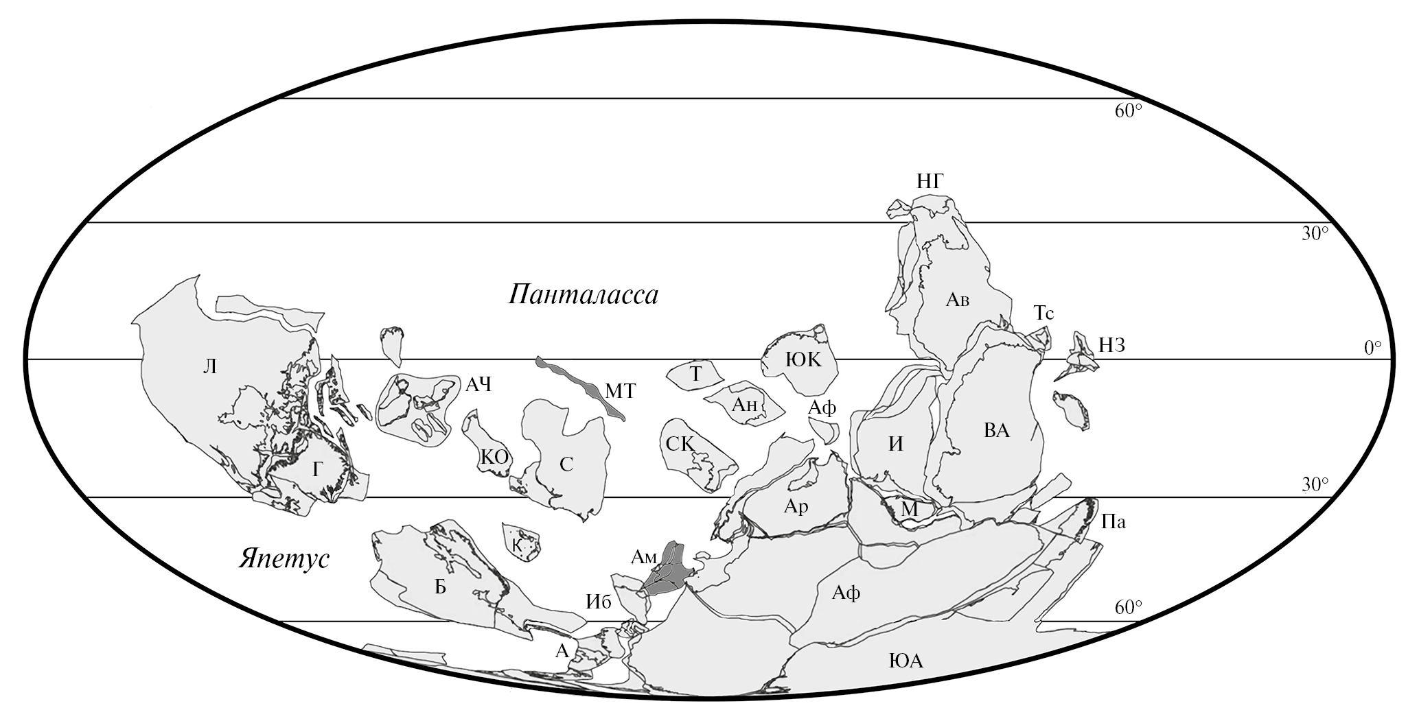Рис. 1. Палеогеографическая реконструкция для раннекембрийского времени [2]; обозначения основных континентов и крупных террейнов: А – Авалония, АЧ – Арктическая Аляска и Чукотка, Ав – Австралия, Ам – Армориканские террейны, Ан – Аннамия, Ар – Аравия, Аф – Африка, Б – Балтийская платформа, ВА – Восточная Антарктика, Г – Гренландия, И – Индостан, Иб – Иберийский массив, К – Карский микроконтинент, КО – Колымо-Омолонский микроконтинент, Л – Лаврентия, М – Мадагаскар, МТ – Монгольские террейны, НГ – Новая Гвинея, НЗ – Новая Зеландия, Па – Патагония, С – Сибирская платформа, СК – Северо-Китайская платформа, Т – Таримский блок, Тс – Тасмания, ЮА – Южная Америка, ЮК – Южно-Китайская платформа.