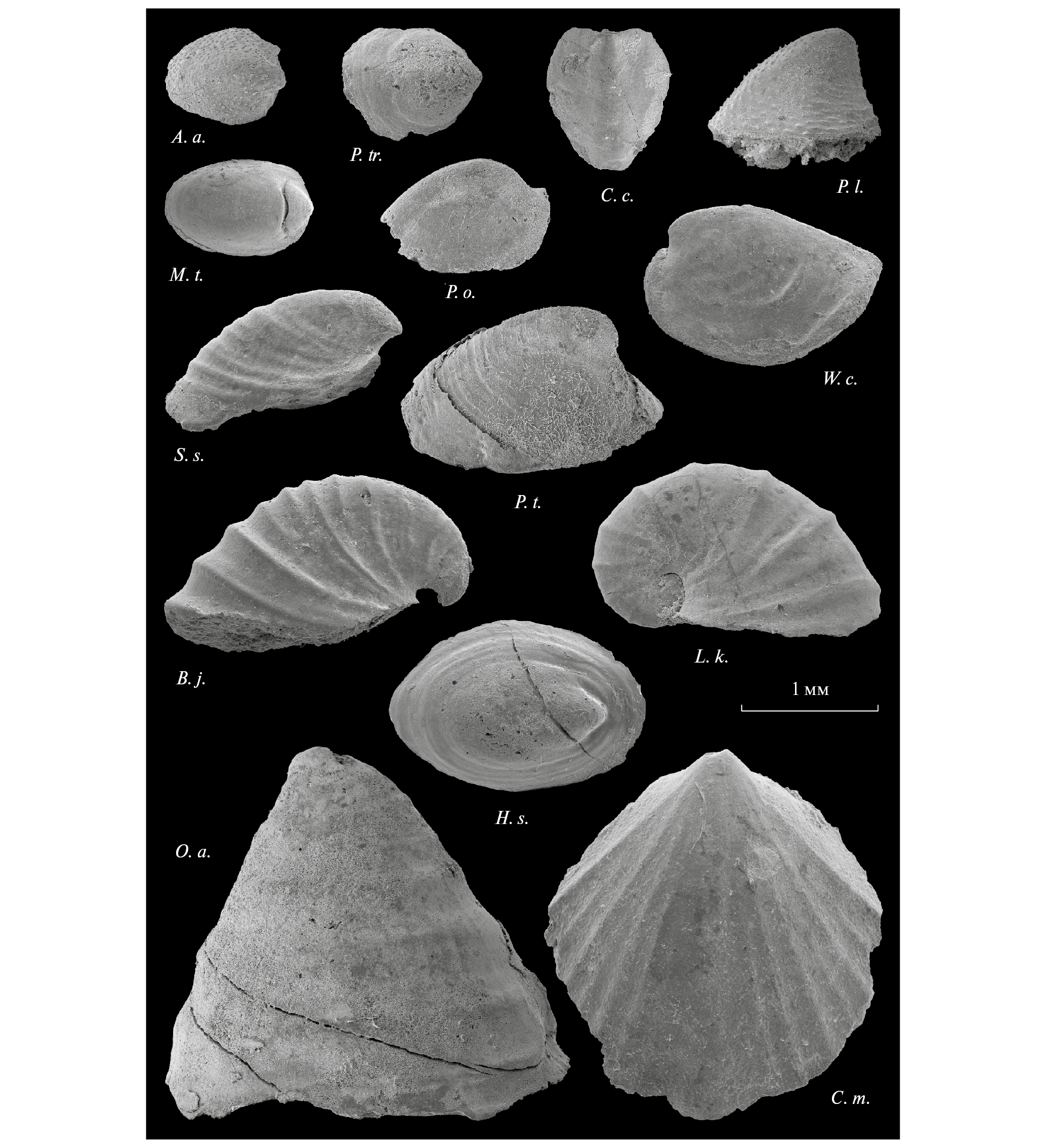 Рис. 2. Раннекембрийские моллюски из средней части баянгольской свиты Западной Монголии, находки которых также отмечены в известняке с Heraultia (Черные горы, департамент Эро, регион Окситания, Франция); масштабная линейка – 1 мм; обозначения: A. a. – Auricullina auriculata (Vassiljeva, 1990) (экз. ПИН, № 3302/1872); B. j. – Bemella jacutica (Missarzhevsky, 1966) (экз. ПИН, № 3302/1876); C. c. – Cambroscutum concameratum Kerber, 1988 (экз. ПИН, № 3302/1845); C. m. – “Calbyella” multicostata Missarzhevsky, 1995 (экз. ПИН, № 3302/1537); H. s. – Helcionella sp. (экз. ПИН, № 3302/1723); L. k. – Latouchella korobkovi (Vostokova, 1962) (экз. ПИН, № 3302/1755); M. t. – Merismoconcha tommotica (Zhegallo, 1996) (экз. ПИН, № 3302/2333); O. a. – Obtusoconus amplus (Zhegallo, 1982) (голотип ПИН, № 3302/1508); P. tr. – Prosinuites tripartitus Kerber, 1988 (экз. ПИН, № 3302/2081); P. o. – Protoconus orolgainicus (Zhegallo, 1996) (экз. ПИН, № 3302/1878); P. l. – Purella layracensis (Kerber, 1988) (экз. ПИН, № 3302/2228); P. t. – Purella tenuis (Zhegallo, 1996) (голотип ПИН, № 3302/1566); S. s. – Securiconus sp. (экз. ПИН, № 3302/1720); W. c. – Watsonella crosbyi Grabau, 1900 (экз. ПИН, № 3302/1747).