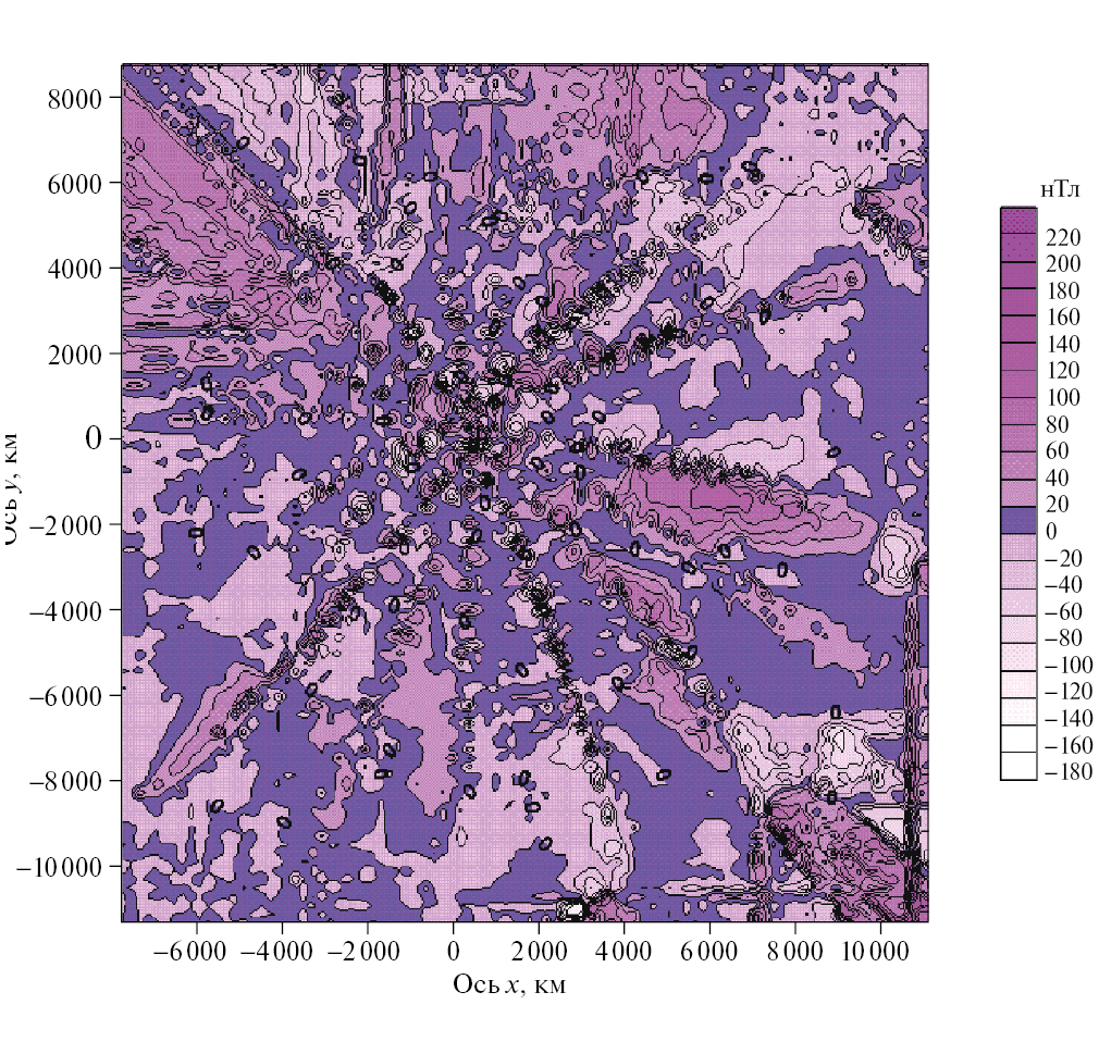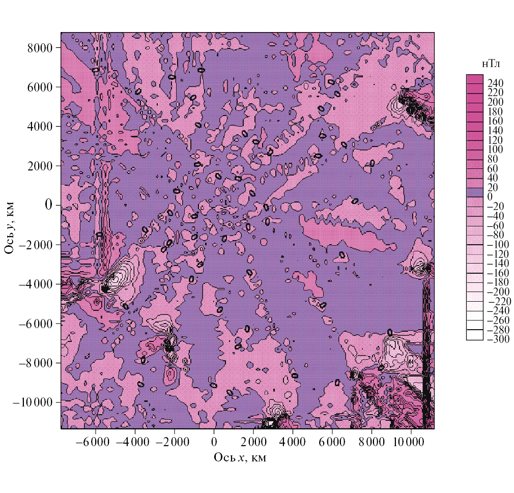 2) находятся компоненты вектора магнитной индукции в нескольких шаровых слоях, толщина которых не превышает 240 км, с помощью определенных на предыдущем этапе распределений эквивалентных источников;