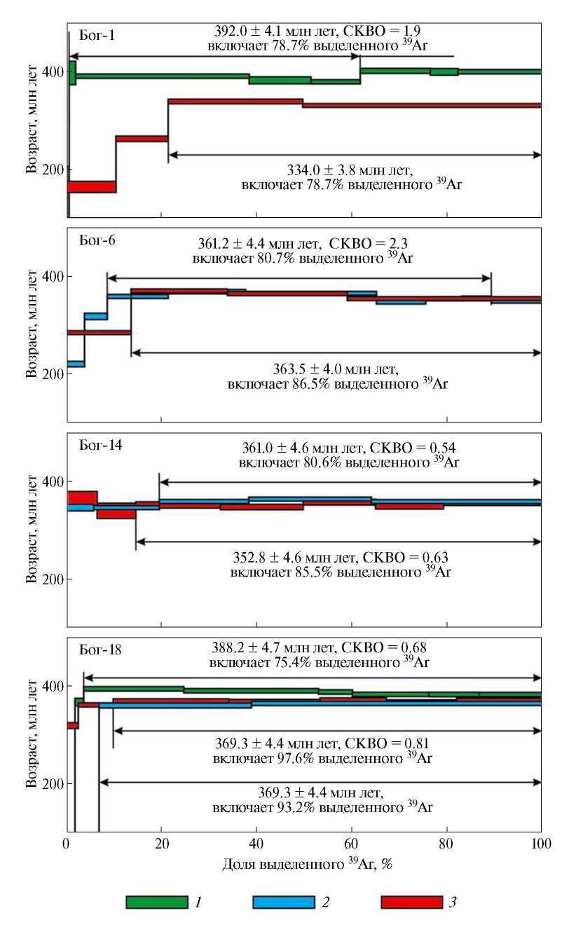 Рис. 3. Возрастные 40Ar/39Ar-спектры для минералов из щелочных пород массива Богдо. Цветом показаны минеральные фракции: 1 – биотита, 2 – нефелина, 3 – КПШ. Бог-1, Бог-6, Бог-14, Бог-18 – см. табл. 1.