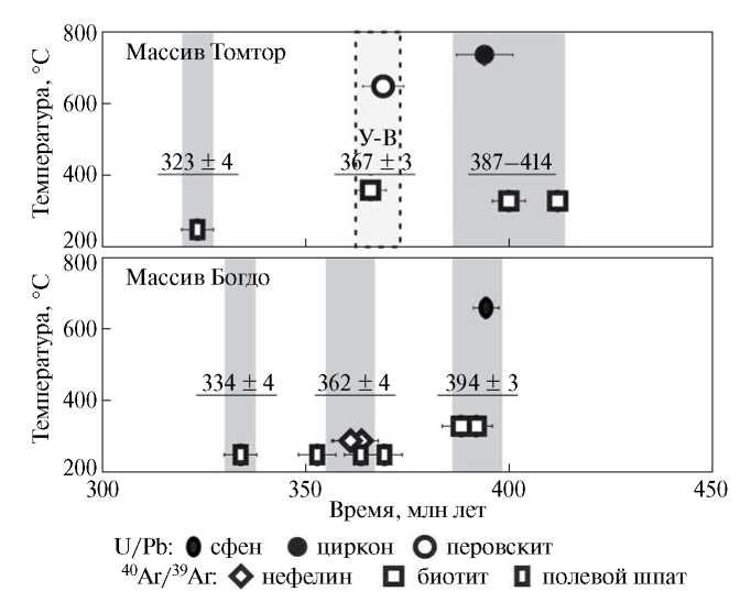 Рис. 4. Сводная термохронологическая диаграмма (палеозойский этап) для минералов из пород массива Томтор [3, 4] и кимберлитовой трубки Удачная-Восточная (У-В со светлым фоном) [9] (сверху); для щелочных пород массива Богдо (снизу). U/Pb-датировка титанита дана по [4].