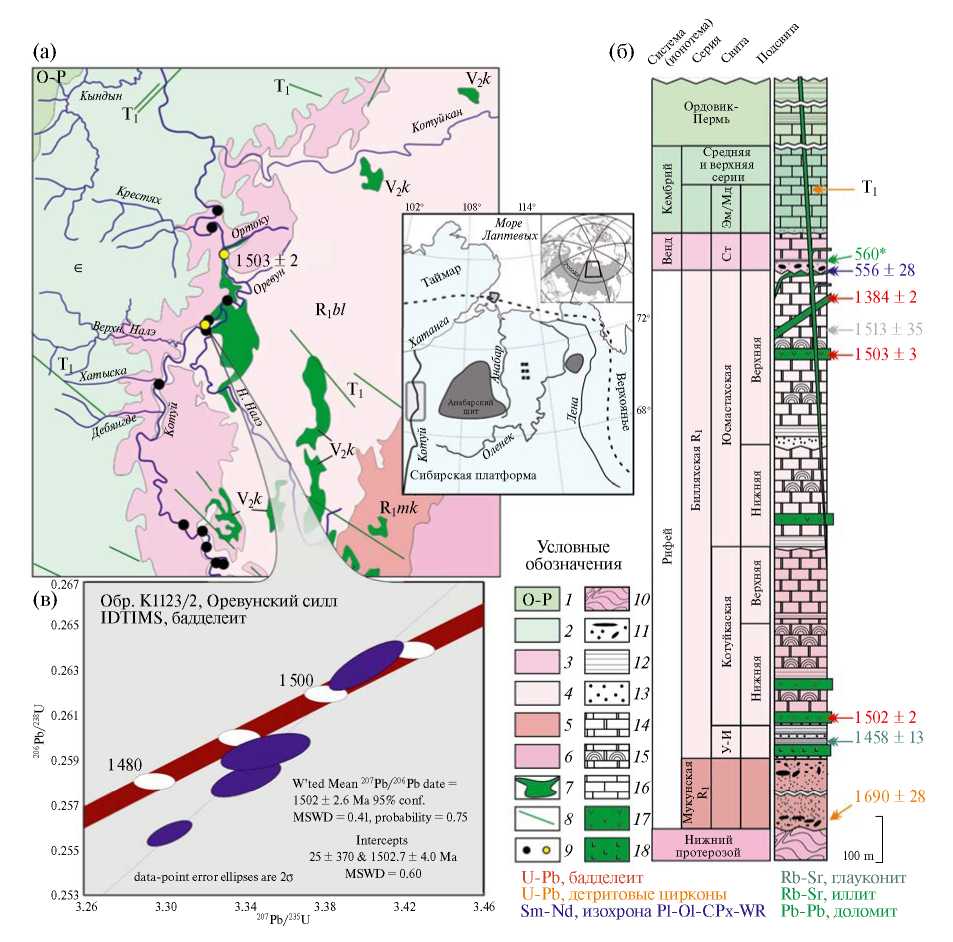 Для типовой интрузии комплекса – Оревунского силла уже после публикации геологической карты [4] было получено U–Pb-определение возраста по бадделеиту 1503±2 млн лет [8]. Для схожих по составу пластовых тел р. Котуйкан известен еще ряд U–Pb-определений возраста в интервале 1490–1503 млн лет [8]. На территории Анабарского массива интрузивные тела с подобными возрастами относятся к кенгединскому комплексу [4], в международном сообществе известном как Куонамская крупная магматической провинции (КМП) [8].