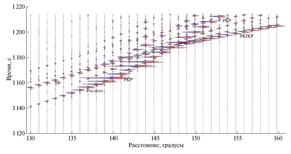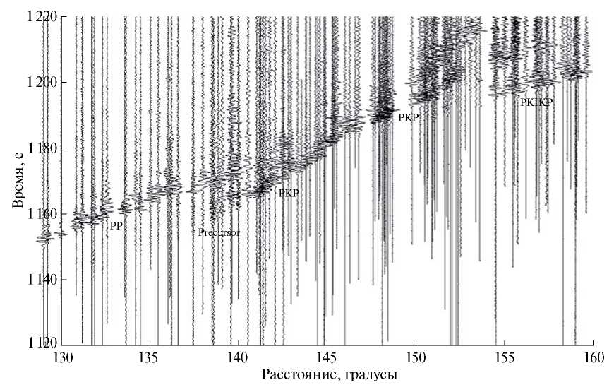 На рис. 2 приведена радиальная (вертикальная) компонента для дискретной (слоистой) модели Земли из [7, 8] в диапазоне эпицентральных расстояний 130–160 градусов. Импульс f(t) в источнике взят в виде функции Гаусса в (1) с несущей частотой в 1 герц. По горизонтали приведено расстояние в градусах. По вертикали – время (возрастает вверх). Из рис. 2 видно, что впереди PKP-волн возникают высокочастотные колебания небольшой амплитуды (предвестники). Спектральный анализ показал, что их частота примерно равна 1.25 герца.