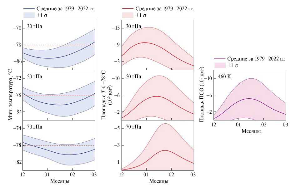 Рис. 1. Внутрисезонный ход минимальной температуры в области 60–90° с. ш., площади с температурой T ≤ –78°C на уровнях 30, 50 и 70 гПа и площади ПСО над Арктикой на уровне 460 K в зимний период в среднем за 1979– 2022 гг. со среднеквадратичными отклонениями (СКО, ±1 σ).