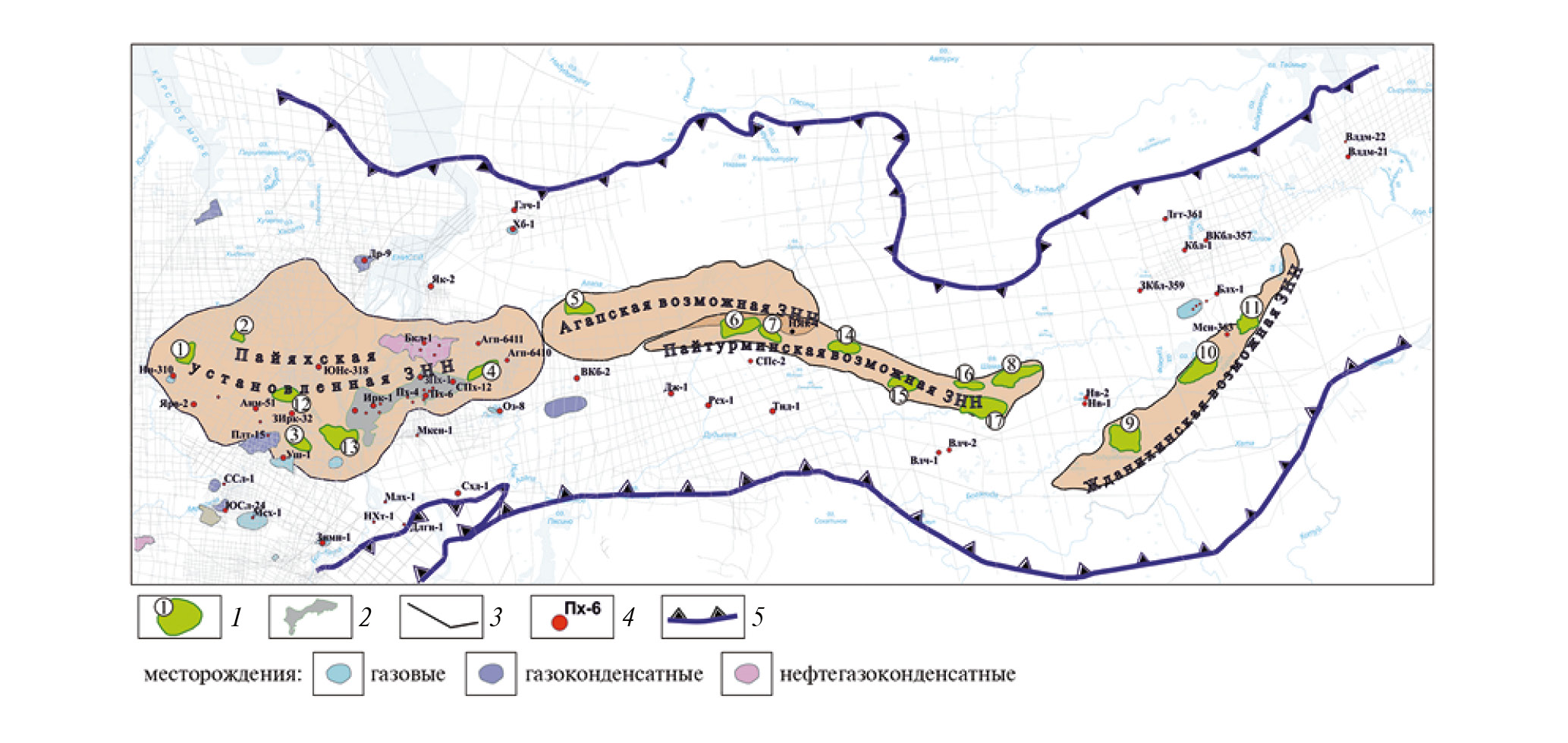 Рис. 1. Схема распространения зон нефтенакопления в клиноформном комплексе ЕХРП. 1 – выявленные перспективные литологические или структурно-литологические ловушки: (1 – Нанадянская, 2 – Салпадаяхская, 3 – Восточно-Бирюзовая, 4 – Агапская, 5 – Сиенская, 6 – Пясинская, 7 – Шайтанская, 8 – Пайтурминская, 9 – Боганидская, 10 – Лабазная, 11 – Северо-Массоновская, 12 – Проточная, 13 – Иркинская, 14 – Восточно-пясинская, 15 – Западно-Авамская, 16 – Сиговая, 17 – Восточно-Авамская); 2 – Пайяхский кластер нефтяных месторождений; 3 – сейсмические профили; 4 – скважины глубокого бурения; 5 – границы ЕХРП.