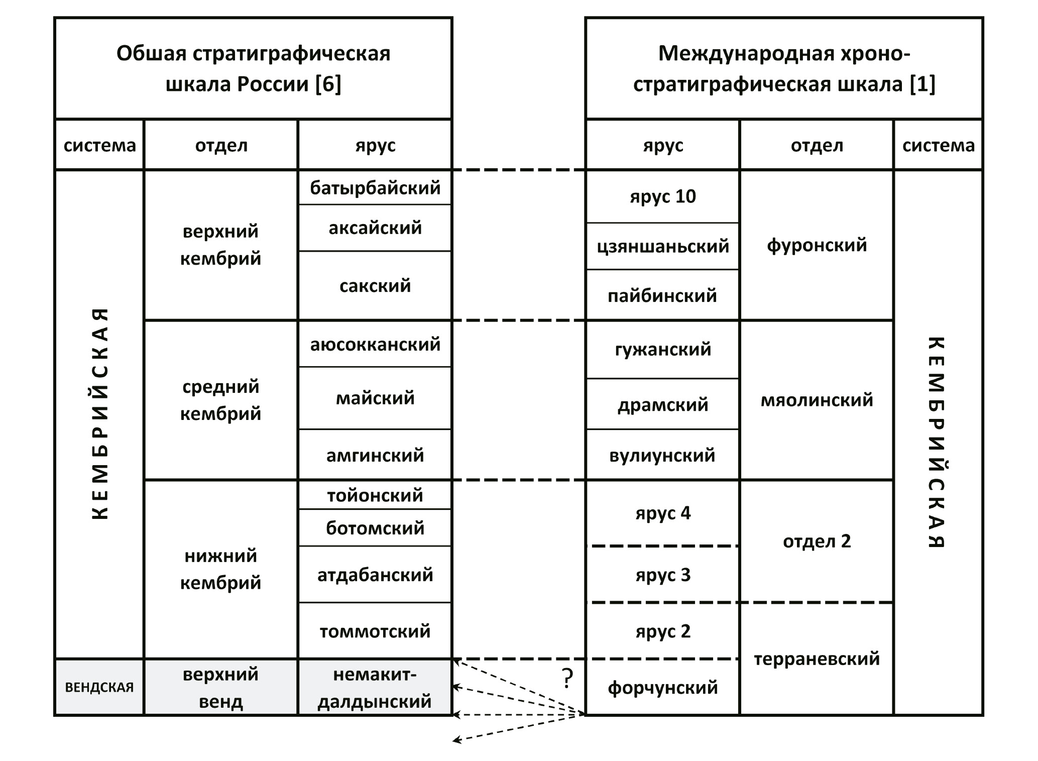 Рис. 1. Соотношение подразделений кембрия Общей стратиграфической шкалы России и Международной хроностратиграфической шкалы.