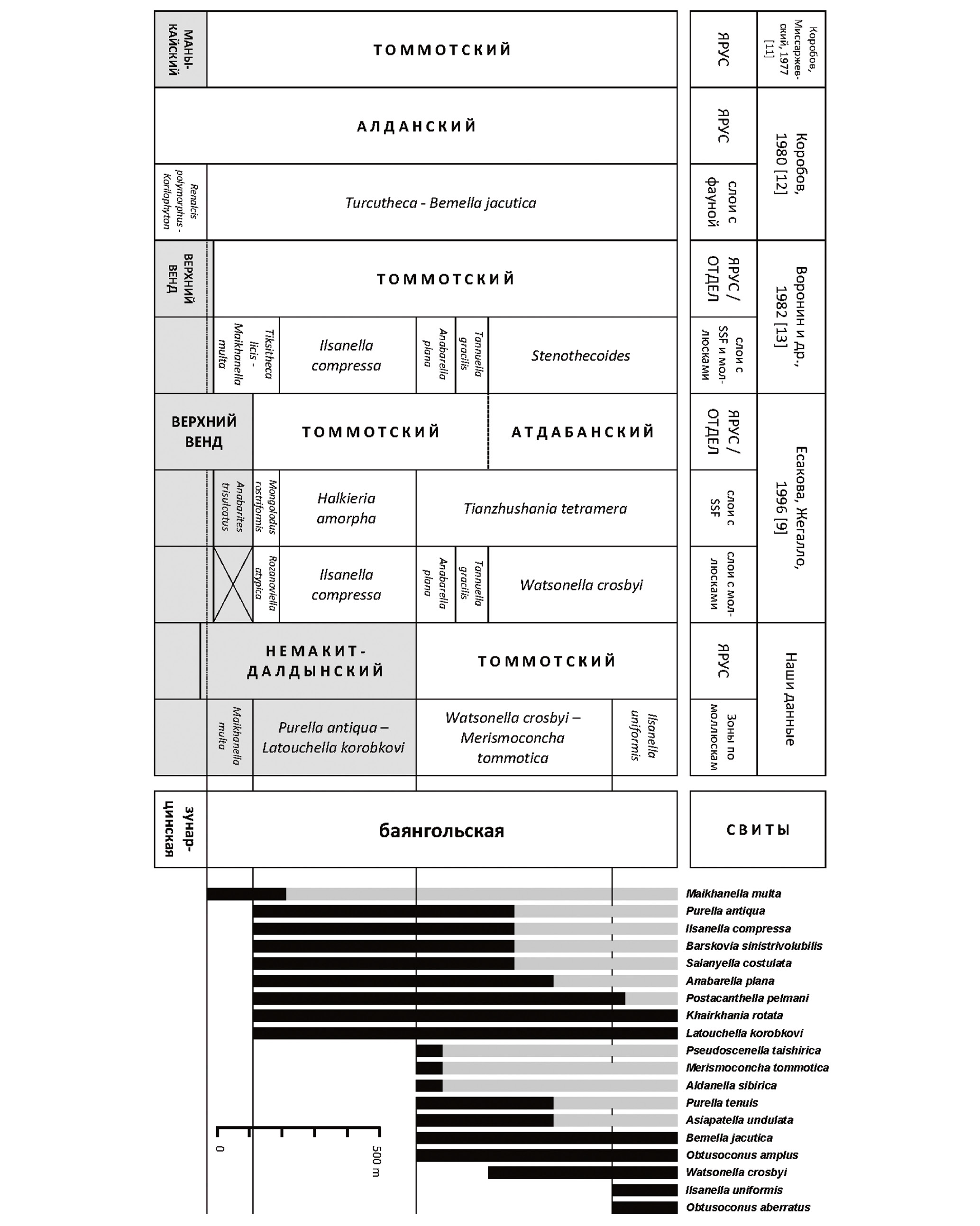 Рис. 2. Положение границы докембрия – кембрия в баянгольской свите Дзабханской структурно-фациальной зоны Западной Монголии по разным авторам [9, 11–13] (докембрийские подразделения залиты серым) и обобщенное стратиграфическое распространение основных видов моллюсков.