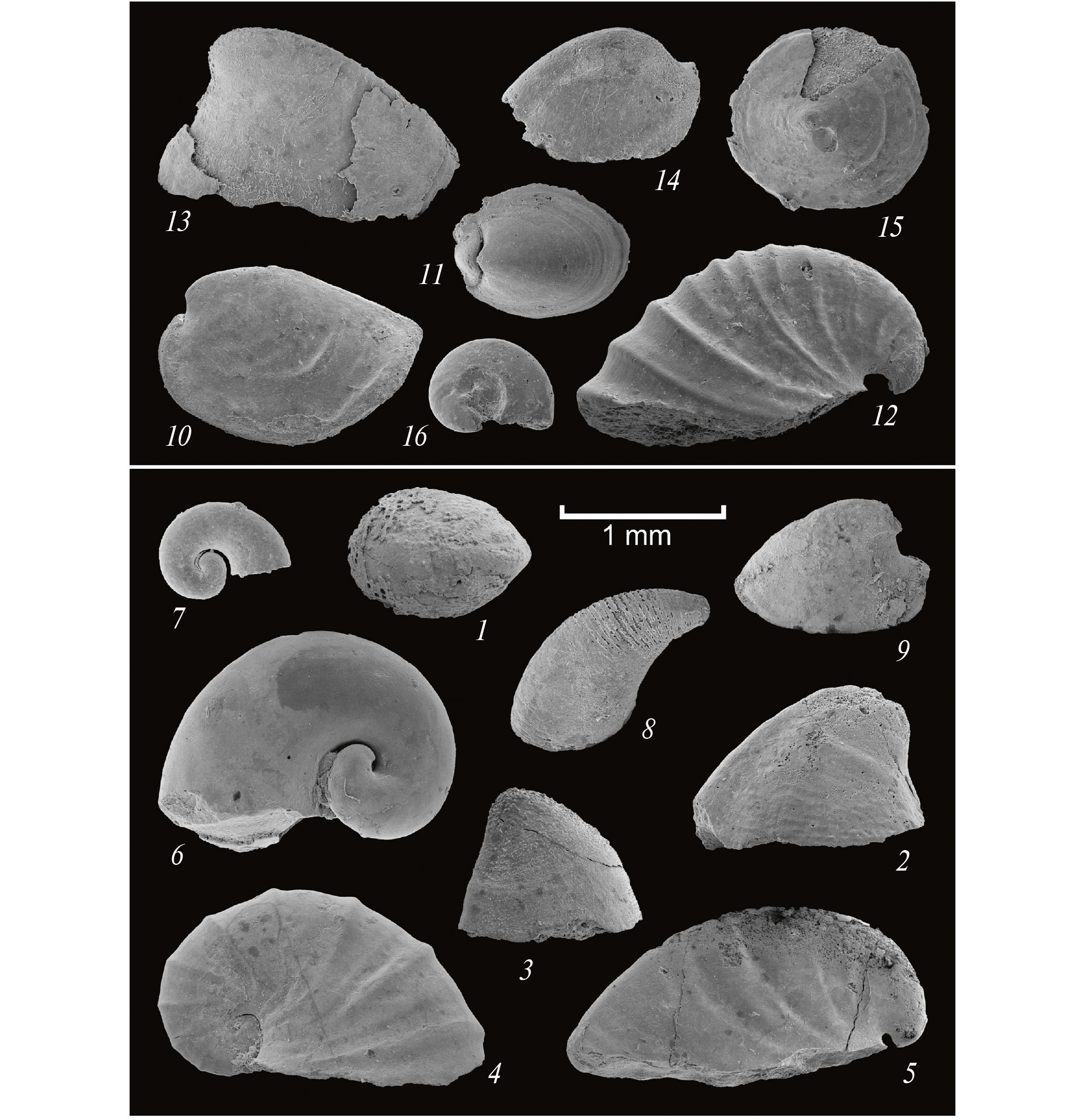 Рис. 3. Зональные виды моллюсков комплексов зоны Purella antiqua – Latouchella korobkovi (1–9; немакит-далдынский ярус, верхний венд) и зоны Watsonella crosbyi – Merismoconcha tommotica (10–16; томмотский ярус, нижний кембрий) из баянгольской свиты Западной Монголии: 1 – Maikhanella multa Zhegallo, 1982, экз. ПИН, № 3302/2389, разрез Баян-гол; 2 – Purella antiqua (Abaimova, 1976), экз. ПИН, № 3302/2066, разрез Салааны-гол; 3 – Postacanthella pelmani Zhegallo, 1996, экз. ПИН, № 3302/1750, разрез Салааны-гол; 4 – Latouchella korobkovi (Vostokova, 1962), экз. ПИН, № 3302/1755, разрез Салааны-гол; 5 – Anabarella plana Vostokova, 1962, экз. ПИН, № 3302/2364, разрез Баян-гол; 6 – Barskovia sinistrivolubilis (Missarzhevsky, 1981), голотип ГИН, № 4294/9, разрез Салааны-гол; 7 – Khairkhania rotata Missarzhevsky, 1981, экз. ПИН, № 3302/1530, разрез Салааны-гол; 8 – Salanyella costulata Missarzhevsky, 1981, экз. ПИН, № 3302/1799, разрез Салааны-гол; 9 – Ilsanella compressa Zhegallo, 1982, экз. ПИН, № 3302/1518, разрез Салааны-гол; 10 – Watsonella crosbyi Grabau, 1900, экз. ПИН, № 3302/1747, разрез Салааны-гол; 11 – Merismoconcha tommotica (Zhegallo, 1996), экз. ПИН, № 3302/1953, разрез Хэвтэ-Цахир-Нуруу; 12 – Bemella jacutica (Missarzhevsky, 1966), экз. ПИН, № 3302/1876, разрез Салааны-гол; 13 – Purella tenuis Zhegallo, 1996, голотип ПИН, № 3302/1566, разрез Салааны-гол; 14 – Protoconus orolgainicus (Zhegallo, 1996), экз. ПИН, № 3302/1878, разрез Салааны-гол; 15 – Asiapatella undulata (Yu, 1981), экз. ПИН, № 3302/1552, разрез Салааны-гол; 16 — Aldanella sibirica Parkhaev et Karlova, 2011, экз. ПИН, № 3302/1521, разрез Салааны-гол.