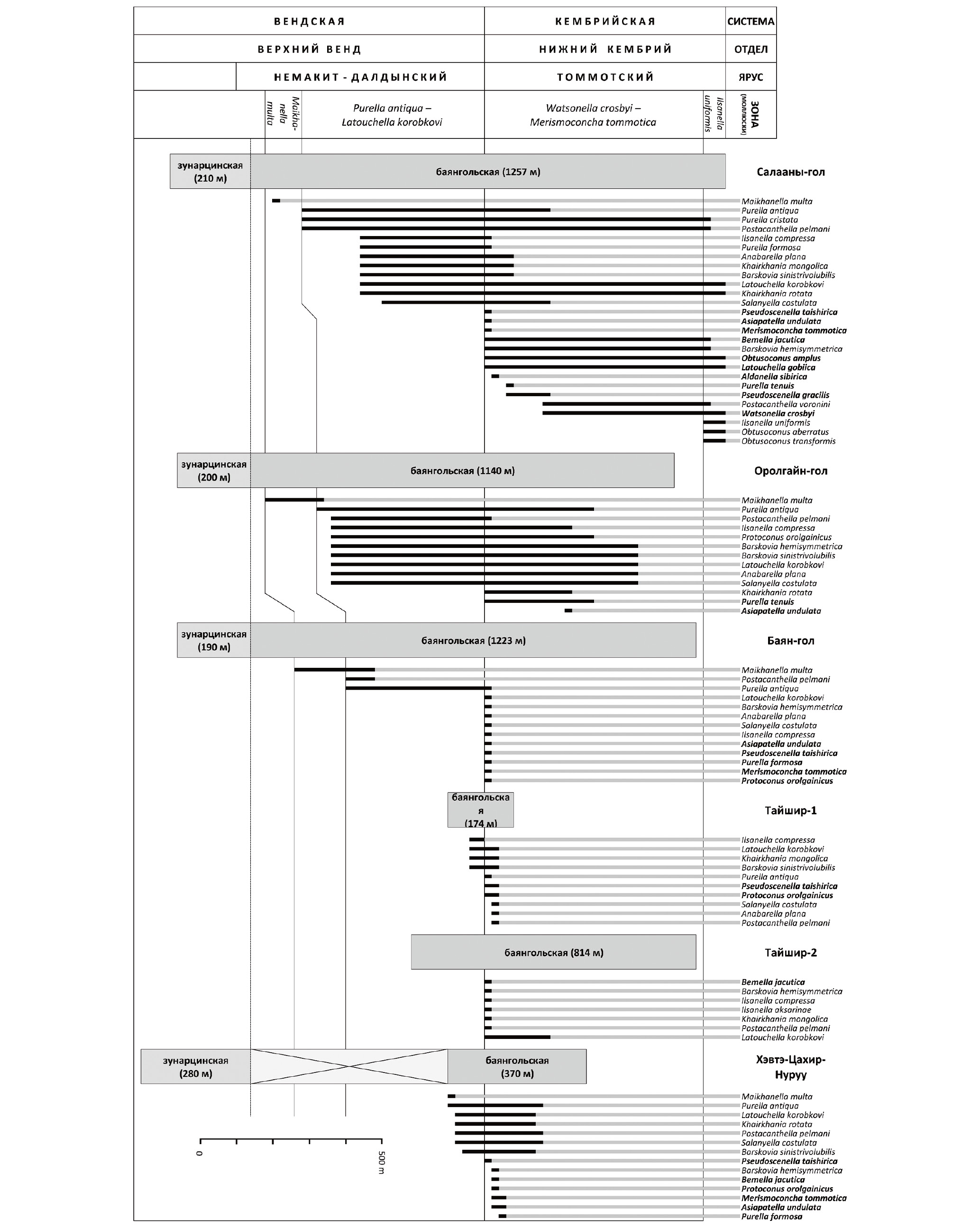 Рис. 4. Корреляция изученных разрезов баянгольской свиты Дзабханской структурно-фациальной зоны Западной Монголии и стратиграфическое распространение моллюсков (полужирным шрифтом выделены виды зоны Watsonella crosbyi – Merismoconcha tommotica).