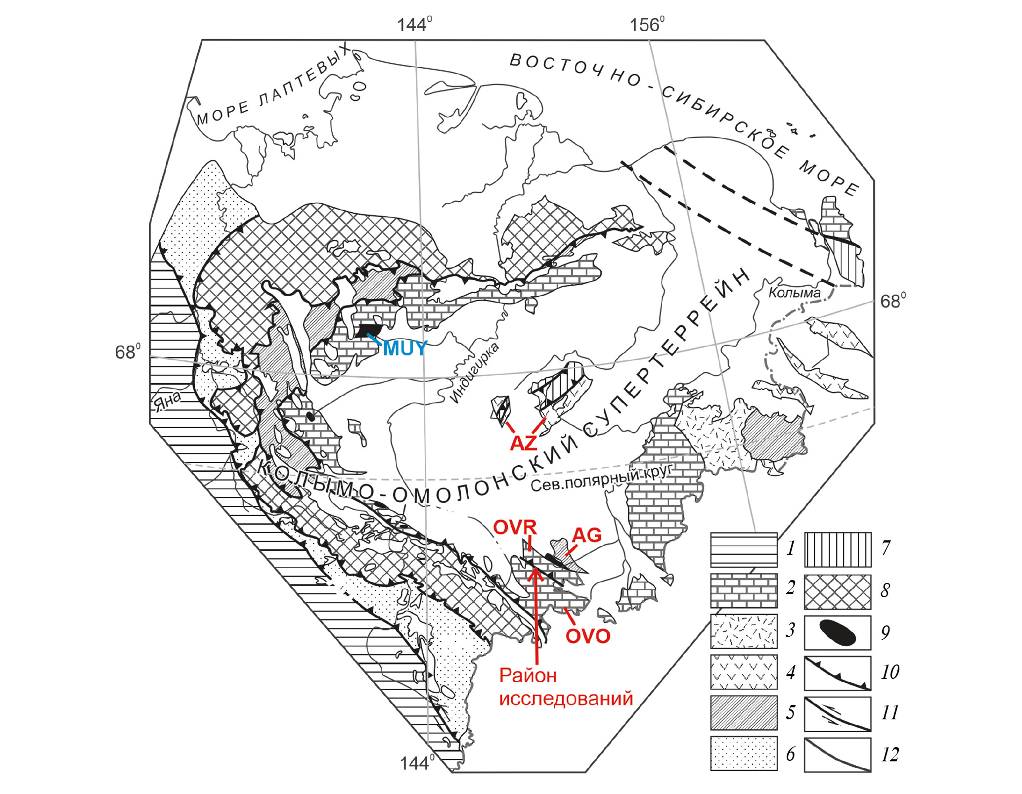 Рис. 1. Положение района исследований на схеме тектонического районирования Верхояно-Колымской складчатой области [3] с изменениями по [2] и упрощениями. 1 – Верхоянский складчато-надвиговый пояс; террейны: 2 – пассивной континентальной окраины; 3 – кратонный (Омолонский); 4 – островодужные; 5 – турбидитовые; 6 – турбидитовый подножия континентальной окраины (сланцевый пояс); 7 – аккреционного клина, сложенные преимущественно океаническими отложения; 8 – аккреционного клина, преимущественно турбидитовый (Полоусно-Дебинский); 9 – массивы офиолитов; 10 – надвиги; 11 – сдвиги; 12 – разломы. AG – Арга-Тасский, AZ – Алазейский, OVO – Омулевский, OVR – Рассохинский террейны; MUY – Уяндинский офиолитовый массив.