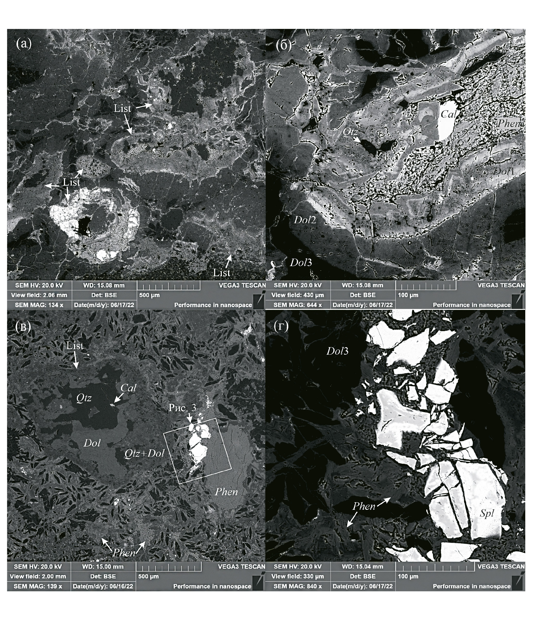 Рис. 2. Хромистый фенгит в лиственитовом песчанике. Изображения во вторично-рассеянных электронах: (а) участок песчаника, насыщенный обломками лиственитов, (б) мелкочешуйчатый агрегат фенгита в литокласте лиственита; (в) крупное зерно фенгита в срастании с хромшпинелидом и агрегаты мелких пластинчатых зерен слюды в основной массе; (г) мелкие зерна пластинчатого фенгита в срастании с хромшпинелидом. Сокращения: List – лиственит, Cal – кальцит, Dol1 – доломит в составе литокластов лиственита, Dol2 – железистый доломит кайм вокруг литокластов лиственита и сети прожилков, слагающих цемент песчаника, Dol3 – доломит мелких литокластов доломитовых пород, Phen – хромистый фенгит, Qtz – кварц, Spl – хромшпинелид.