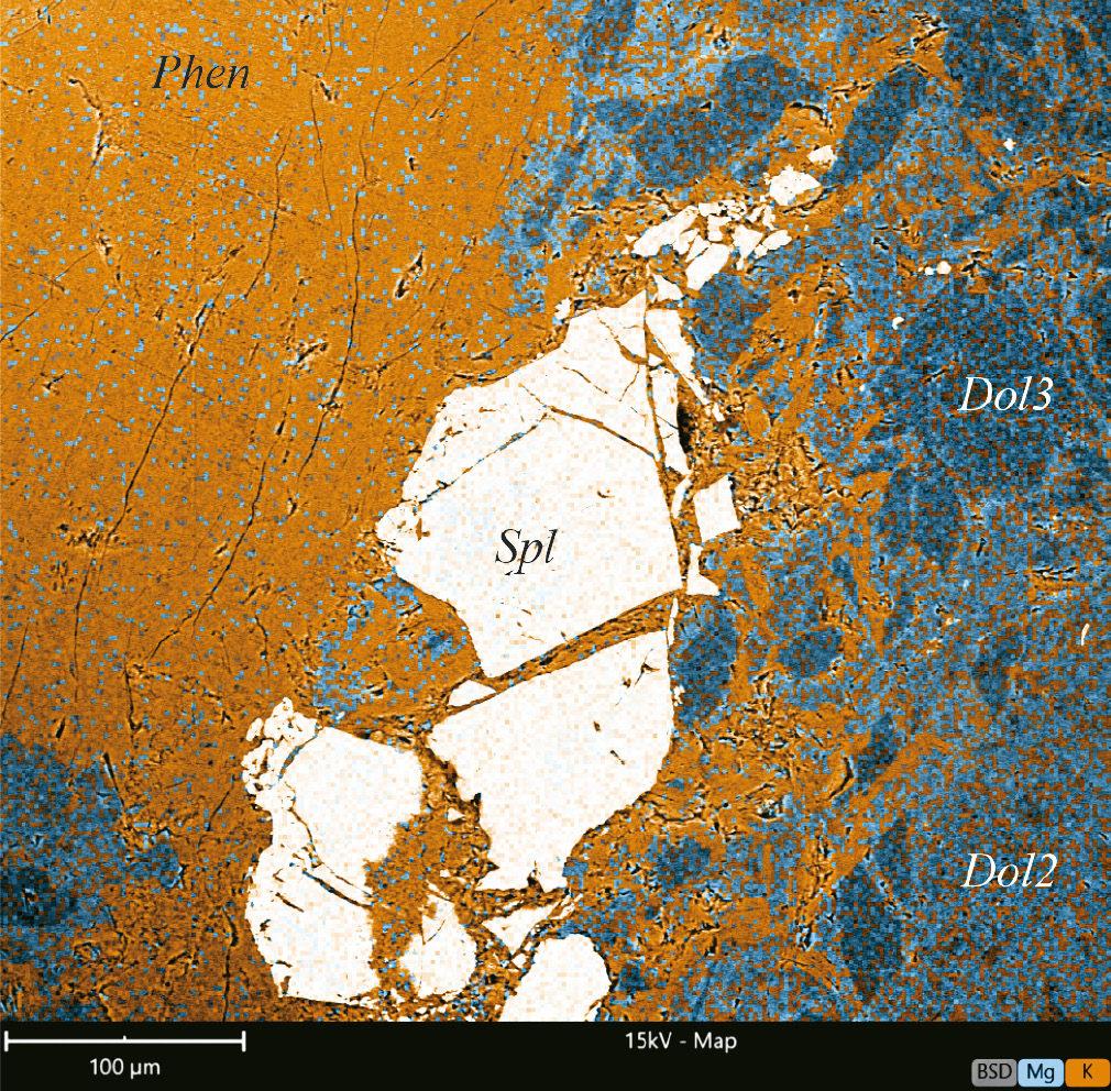 Рис. 3. Распределение калия и магния в слюде и доломитах.