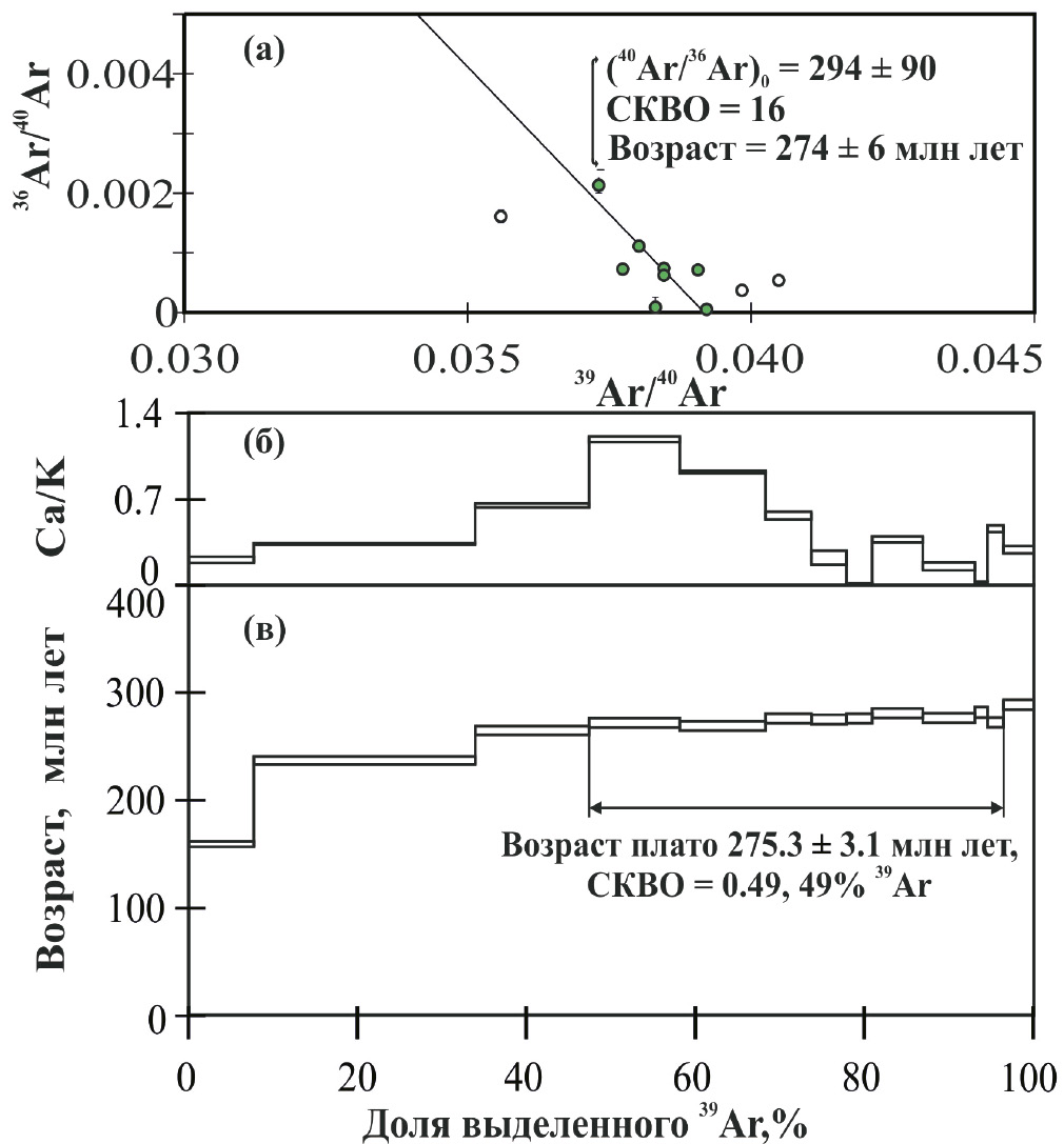 Результаты 40Ar/39Ar-исследований слюды приведены в табл. 2 и представлены на рис. 4 а–в. Использованный метод датирования на основе ступенчатого прогрева описан в примечании к табл. 2. В возрастном спектре (рис. 4 в) после лестницы вверх выделяется плато из 9 ступеней, характеризующееся значением возраста 275.3 ± 3.1 млн лет, среднеквадратичным отклонением СКВО = 0.49, долей выделенного 39Ar 49%. Это несущественно меньше 50%, что практически удовлетворяет критериям плато [1]. Величина Са/К-отношения в спектре (рис. 4 б) варьирует в диапазоне 0–1.2, что выходит за пределы диапазона величин этого отношения 0.02–0.09 в зернах хромистого фенгита, рассчитанных на основе определений концентраций в нем соответствующих элементов энергодисперсионным методом. Максимальные величины Са/К-отношения в спектре достигаются при температурах 650–700°C (табл. 2), что соответствует разложению в вакууме кальцита и доломита. Учитывая, что значения рассчитанного возраста при этом согласуются между собой, логично предположить, что произошло наложение аргона, выделяемого из фенгита, с аргоном из Ca-минералов (доломита и/или кальцита), от которых не удалось избавиться при выделении минеральной фракции. На изохронной диаграмме (рис. 4 в) 7 точек формируют линейную регрессию, характеризующуюся СКВО = 16, значением возраста 274 ± 6 млн лет, согласующимся в пределах ошибки с возрастом плато, и значением начального отношения (40Ar/36Ar)0, согласующимся с воздушным. Это свидетельствует в пользу отсутствия захваченного радиогенного 40Ar в решетке минерала. Учитывая заметную степень дискордантности и большую ошибку возраста линейной регрессии, логично принять возраст плато как оценку возраста закрытия изотопной системы хромистого фенгита.
