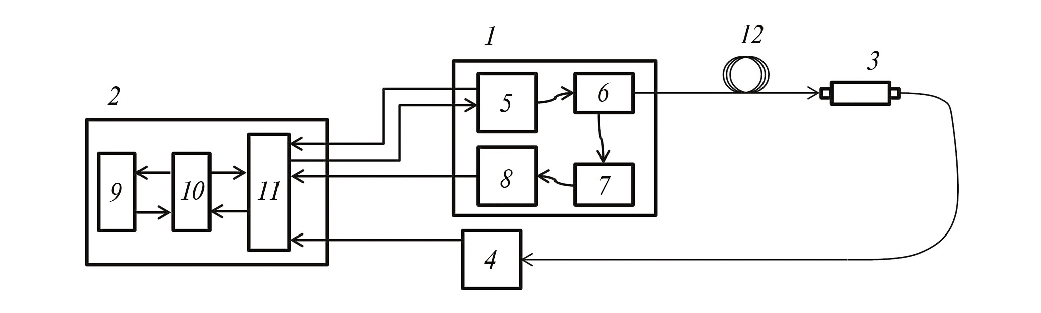 Рис. 2. Блок-схема лидара дифференциального поглощения на основе диодных лазеров ближнего ИК-диапазона для измерения концентрации газов: 1 – блок лазерного излучения, 2 – блок управления, приема и обработки данных, 3 – приемо-передающая оптическая система с волоконным входом, 4 – детектор аналитического сигнала, 5 – модуль диодного лазера, 6 – волоконный разветвитель, 7 – кювета сравнения с интерферометром Фабри-Перо, 8 – детектор сигнала сравнения, 9 – цифровой программируемый модуль, 10 – модуль ЦАП и АЦП, 11 – модуль преобразователей аналоговых сигналов, 12 – волоконно-оптический кабель.
