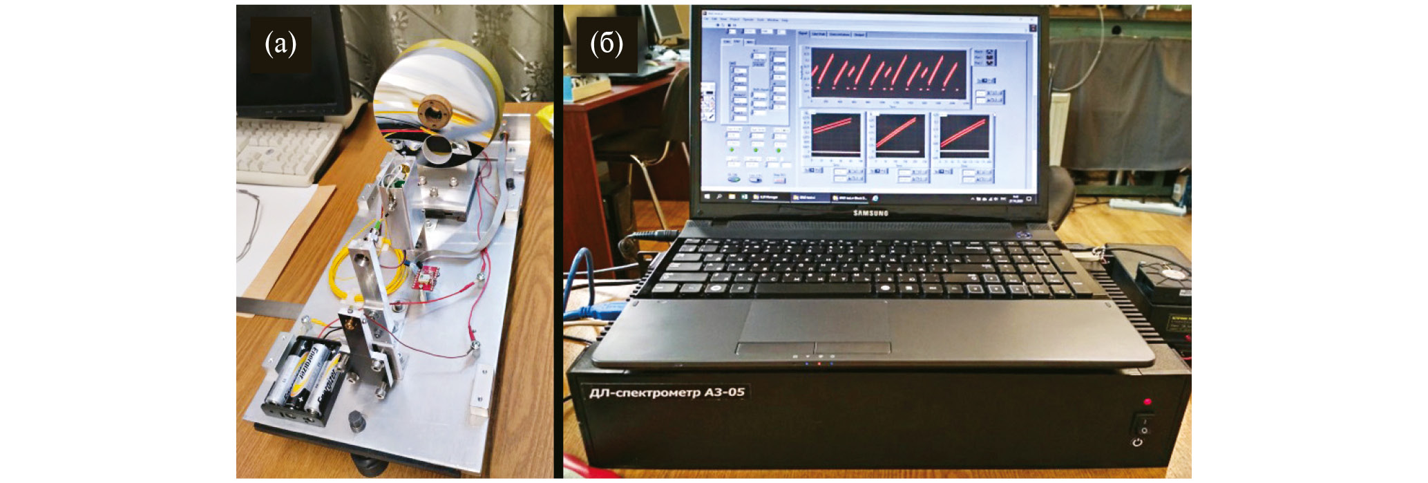 Рис. 3. а) Общий вид приемо-передающего блока лидара дифференциального поглощения, б) электронный блок управления лидара с компьютером наверху, на мониторе которого показаны примеры перестройки частоты лазеров путем изменения тока накачки.