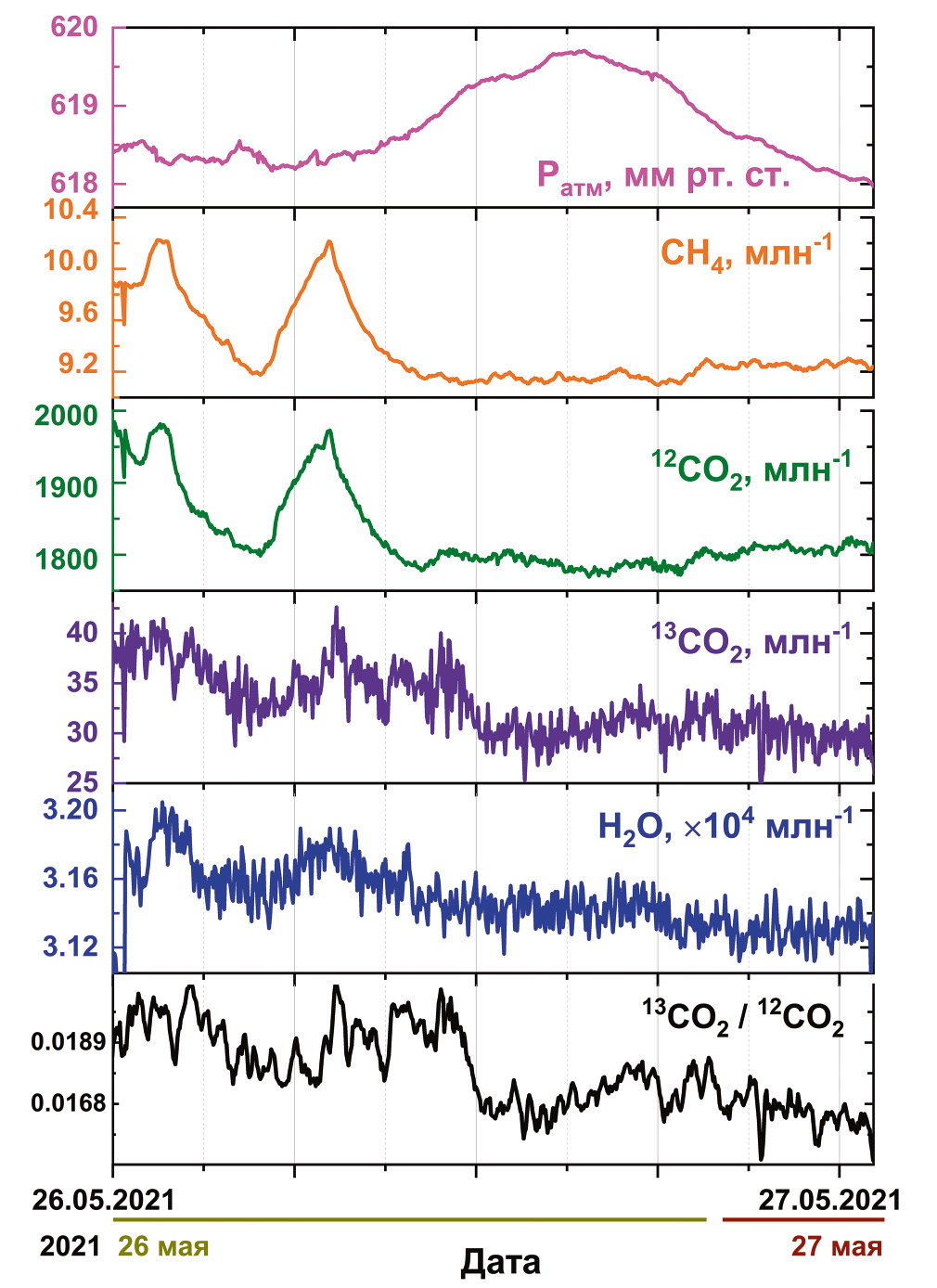 Рис. 4. Вариации атмосферного давления, концентраций газов СН4,12CO2 и 13CO2, H2O и отношения 13CO2/12CO2.
