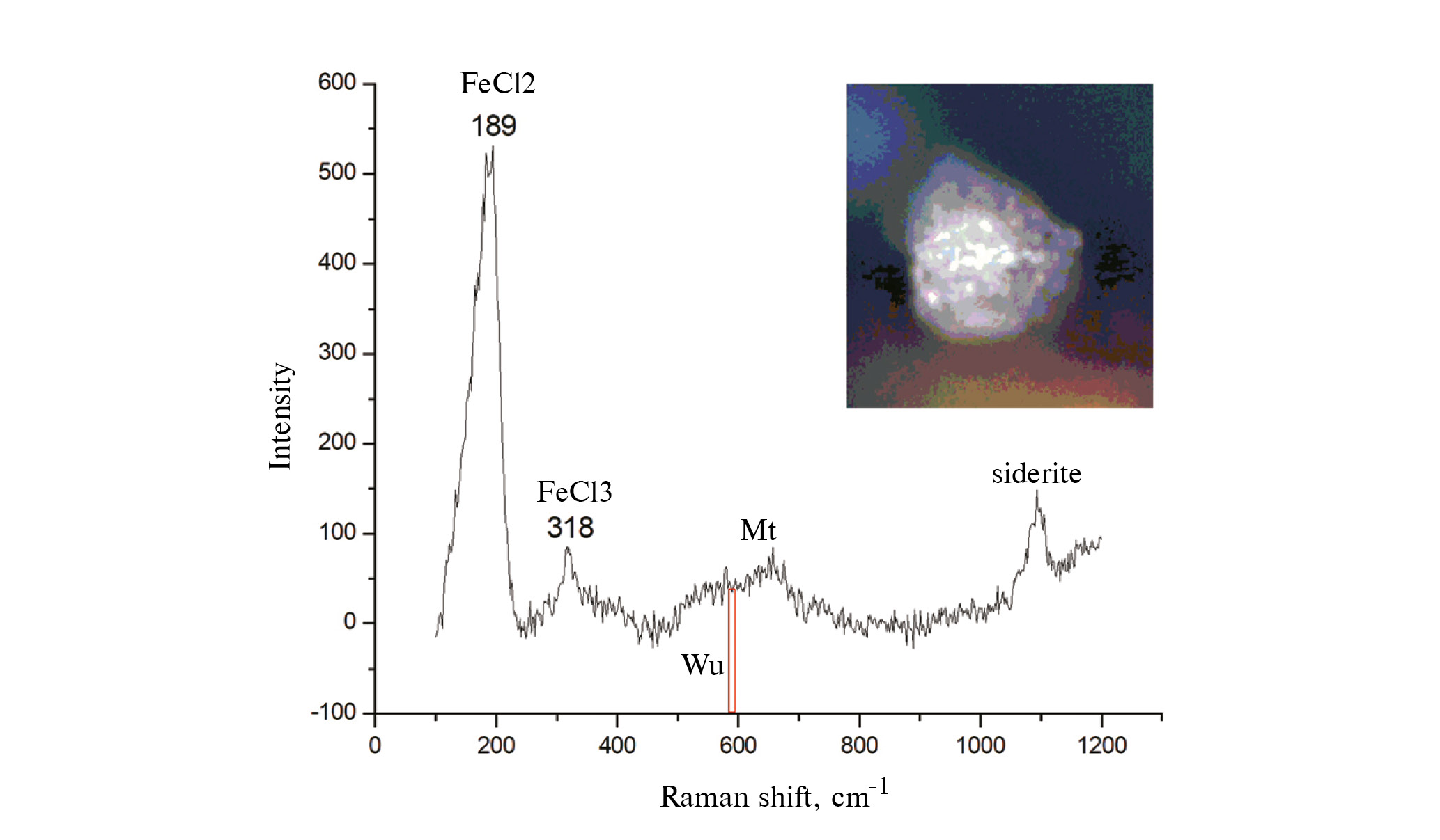 Хлориды железа, образующиеся в результате обменных реакций NaCl с магнетитом, удалось идентифицировать методом Рамановской спектроскопии. Как FeCl3, так и в меньшей степени и FeCl2, являются гигроскопичными солями. На рис. 4 представлен спектр частично разложившегося сидерита, со слабовыраженными полосами магнетита и четкими полосами k = 189 и 317 см−1. Связь Fe–Cl в кристаллогидрате дихлорида железа (FeCl2 × 4H2O) характеризуется полосой около 190 см−1 [12]. Безводный FeCl2 характеризуется полосой 152 см−1 [13], которая выделяется в некоторых спектрах при разложении вместе с полосой 187–190 см−1. Безводный хлорид FeCl3 имеет самую сильную линию при 332 см−1. В водных растворах FeCl3 самая сильная линия при 315 см−1 приписывается колебаниям Fe–Cl в комплексе FeCl2+ [14]. Кристаллогидраты FeCl3 имеют структурную формулу [FeCl2(H2O)4][FeCl4] × nH2O (n = 0…3), т. е. содержат структурную единицу FeCl2+ и также идентифицируются по линии около 318 см−1. FeCl3 является чрезвычайно гигроскопичной фазой, гидратация которой могла быть вызвана как водой из флюида, так и из атмосферы после опыта.