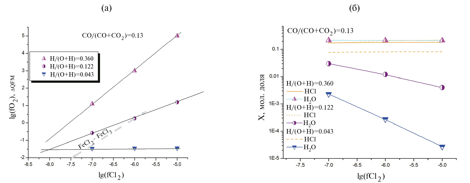 Рис. 5. Рассчитанные, согласно реакциям (9), в маловодном флюиде С–O–H–Cl (отношения Н/(О+Н)≈ХН2О указаны на графиках): а) летучести кислорода, пунктиром нанесена линия отвечающая буферу FeCl2–FeCl3 в присутствии магнетита при различных fO2; б) мольные доли Н2О и HCl в зависимости от lg(XCl2).