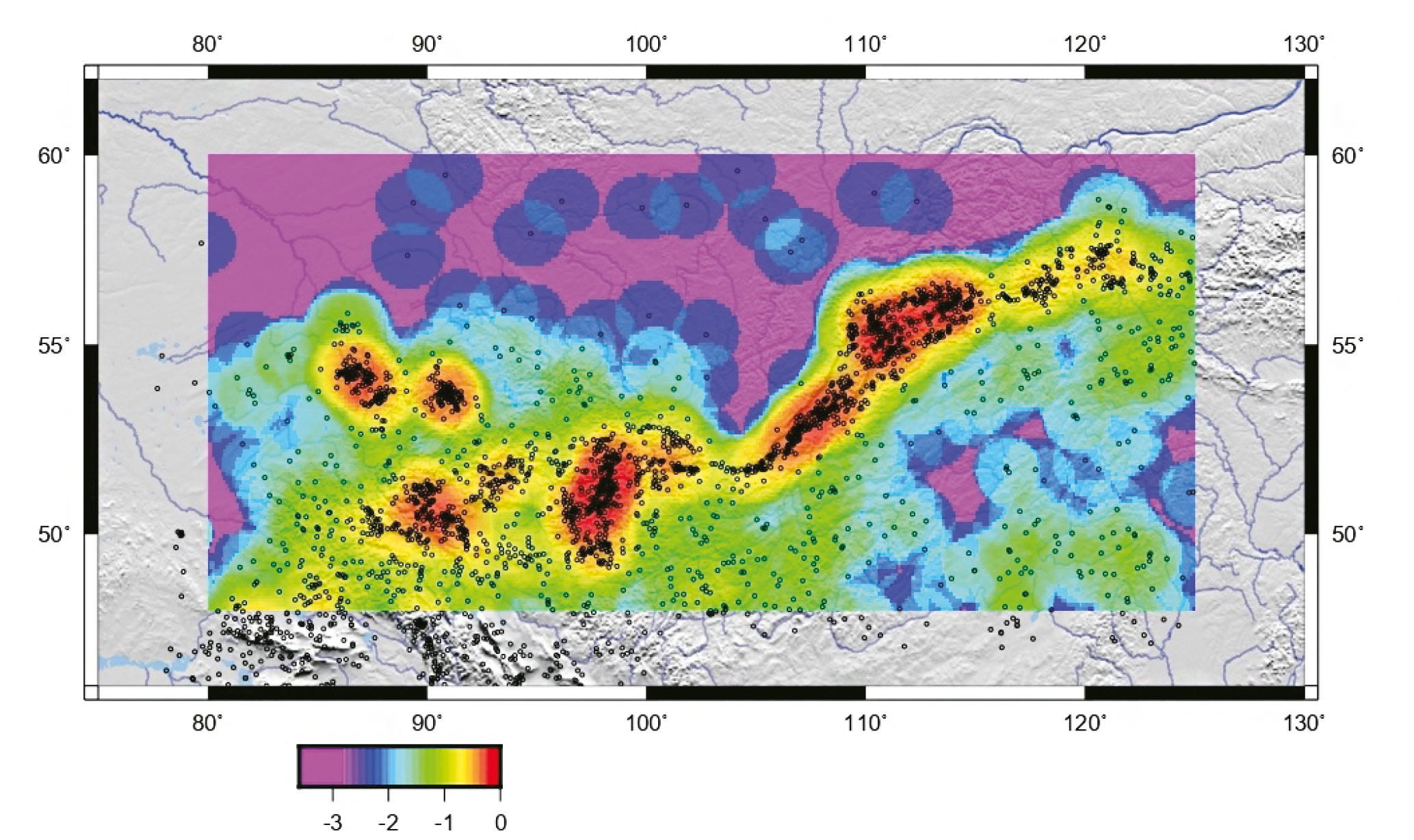 На рис. 1 приведена карта оценки вариаций сейсмической активности в регионах юга Сибири. Карта построена по данным каталога землетрясений за 1982–2021 гг., полученного объединением каталогов из ежегодников “Землетрясения в СССР” за 1982–1991 гг. (оцифрованная версия доступна по ссылке http://www.wdcb.ru/sep/seismology/cat_USSR.ru.html), ежегодников “Землетрясения в Северной Евразии” (1992–2021) (http://zeus.wdcb.ru/wdcb/sep/hp/seismology.ru/ cat_N_Eurasia.ru.html) и каталога Международного сейсмологического центра ISC (http://www.isc.ac.uk). Дубли в каталоге выявлены и удалены по методике работы [14]. Проведена также декластеризация каталога по методике работы [15]. Результирующий каталог доступен по ссылке https://www.itpz-ran.ru/wp-content/rnf/rnf-20-17- 00180/S_Siberia_ForUpload_MainShocks.txt. Локальные оценки представительной магнитуды для каталога (карта доступна по ссылке https://www.itpz-ran.ru/wp-content/rnf/rnf-20-17-00180/Представительная_магнитуда.pdf) позволяют принять значение Mc = 3.5 в качестве региональной оценки. Регион исследования сканируется кругами с постоянным радиусом R = 100км. Шаг сканирования D=0.1 град. Величина , где – оценка числа землетрясений в ячейке с магнитудой M ≥ 3.5, вычисленная по формуле (1). Значения активности привязаны к центрам кругов сканирования.