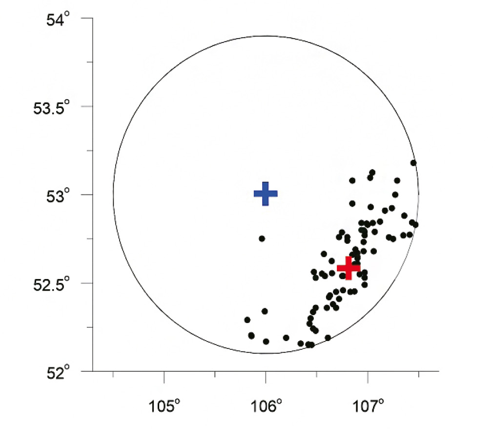 Рис. 2. Карта эпицентров землетрясений в круге с координатами центра (106° в. д., 53° с. ш.). Синим крестом показан центр круга, красным крестом – среднее положение землетрясений (106.8° в. д., 52.6° с. ш.), которое сдвинуто относительно центра круга на 70 км.