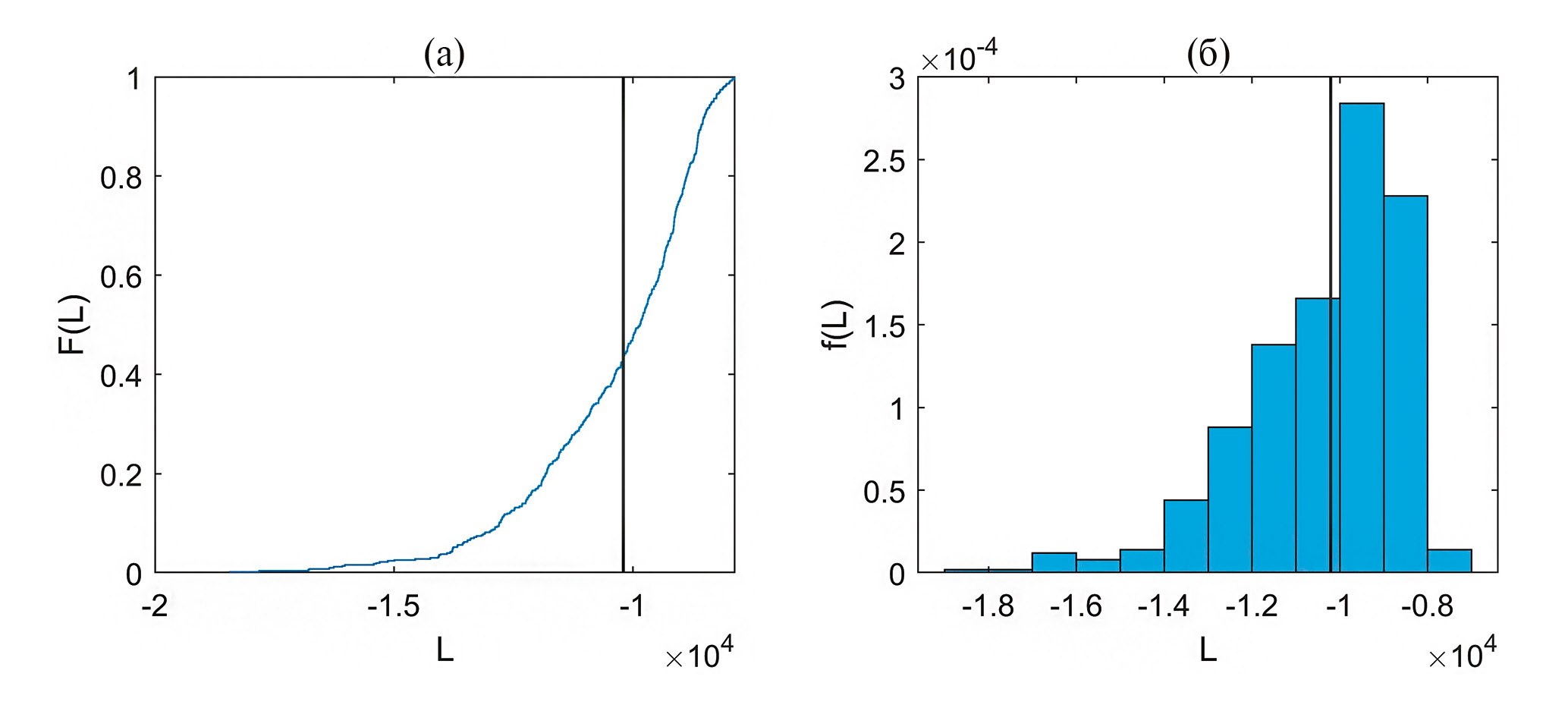При использовании синтетического каталога оценить, достаточно ли велико значение L, чтобы сделать вывод о соответствии модели реальным данным, можно путем многократного применения формулы (4) для непересекающихся частей синтетического каталога землетрясений длительностью T каждый. Для каждой k-й части рассчитывается логарифмическая функция правдоподобия Lk по формуле (4) аналогично расчетам с использованием реального каталога. Затем рассчитывается доля γ случаев, в которых значение правдоподобия по синтетическому каталогу меньше, чем по реальному. Очень маленькое значение γ указывает на то, что наблюдение не согласуется с моделью (на доверительном уровне 100(1-γ)%). На рис. 4 представлены эмпирическое распределение и гистограмма реализаций Lk в сравнении со значением, полученным по фактическому каталогу. Значение L находится вблизи медианы эмпирического распределения, что означает очень хорошее совпадение модели с фактическими данными.