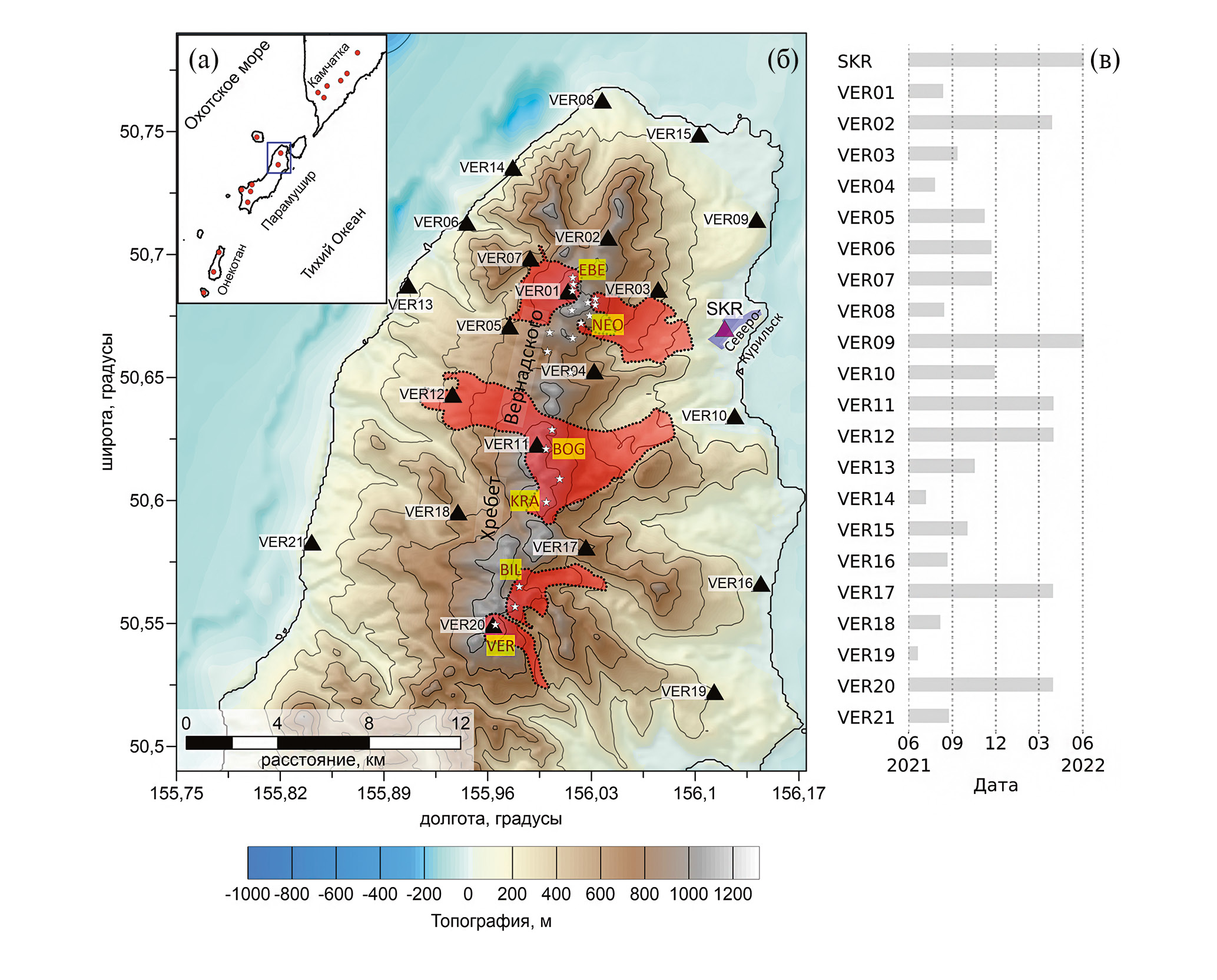 Рис. 1. Район исследования и распределение данных. (а) Карта северных Курильских островов и южной Камчатки с указанием района исследований (синий прямоугольник). Красные точки обозначают голоценовые вулканы. (б) Район исследований с отмеченными временными и постоянными сейсмическими станциями (черный и фиолетовый треугольники соответственно). На фоне изображен рельеф с интервалом в 200 м. Красные области изображают голоценовые потоки лавы. Белые звезды обозначают конусы. Коричнево-желтыми обозначены крупные вулканические центры: VER – Вернадский; BIL – Билибин; KRA – Крашенинников; BOG – Богданович; NEO – Неожиданный; EBE – Эбеко. (в) Графики времени регистрации сейсмических станций.