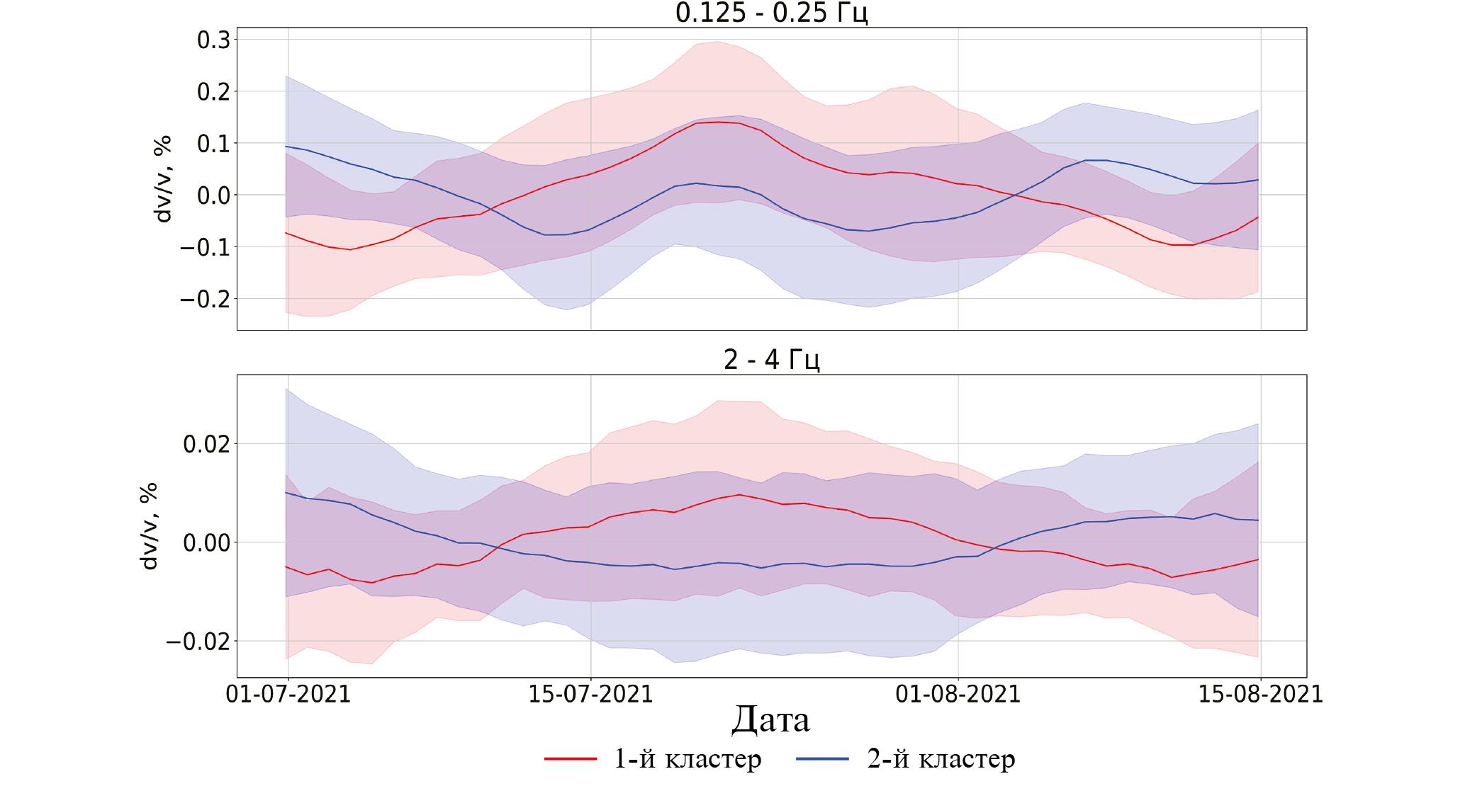 Были построены функции взаимной кросс-корреляции сейсмического шума в диапазонах частот 0.125–0.25 Гц и 2–4 Гц, следуя процедуре, описанной Bensen et al. [10]. Чтобы подавить случайный шум, дневные кросс-корреляции были усреднены в скользящем окне длиной 5 дней. Изменения сейсмических скоростей были определены с помощью кросс-спектрального анализа в скользящем окне без использования эталонного сигнала [11], который представляет собой анализ оконных сигналов в частотной области, основанный на линейной зависимости между фазовыми сдвигами на каждой частоте и задержками времени прихода между оконными сигналами, и на линейной зависимости временных задержек от относительного изменения скорости, справедливой для равномерного изменения скорости во всей среде. Пример полученных изменений сейсмических скоростей показан на рис. 2.