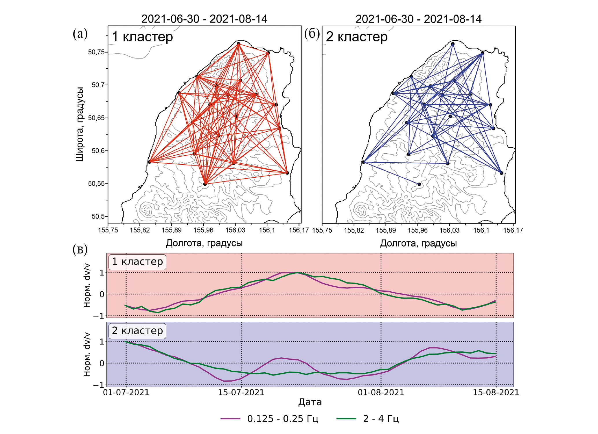 Простейшая модель описывает кода-волны как смесь рассеянных объемных и поверхностных волн [14]. Так как кода-волны являются результатом сложного рассеяния, конкретное местоположения объектов, влияющих на них, довольно трудно определить в сложной геологической обстановке [15]. Поэтому пространственное распределение областей, где произошли изменения скорости, не может быть напрямую определено на основе геометрии пар станций, используемых для кросс-корреляции. По этой причине на рис. 4 а и б не наблюдается четкого разделения пар станций в пространстве, соответствующих двум группам. Глубинная чувствительность кода-волновой части кросс-корреляций в первом приближении может быть описана ядрами чувствительности фундаментальной моды поверхностной волны Релея. Согласно имеющимся ядрам чувствительности для исследуемой области для низкочастотного диапазона максимум чувствительности располагается на глубине 3–5 км, а для высокочастотного – в первых сотнях метров от дневной поверхности [9].