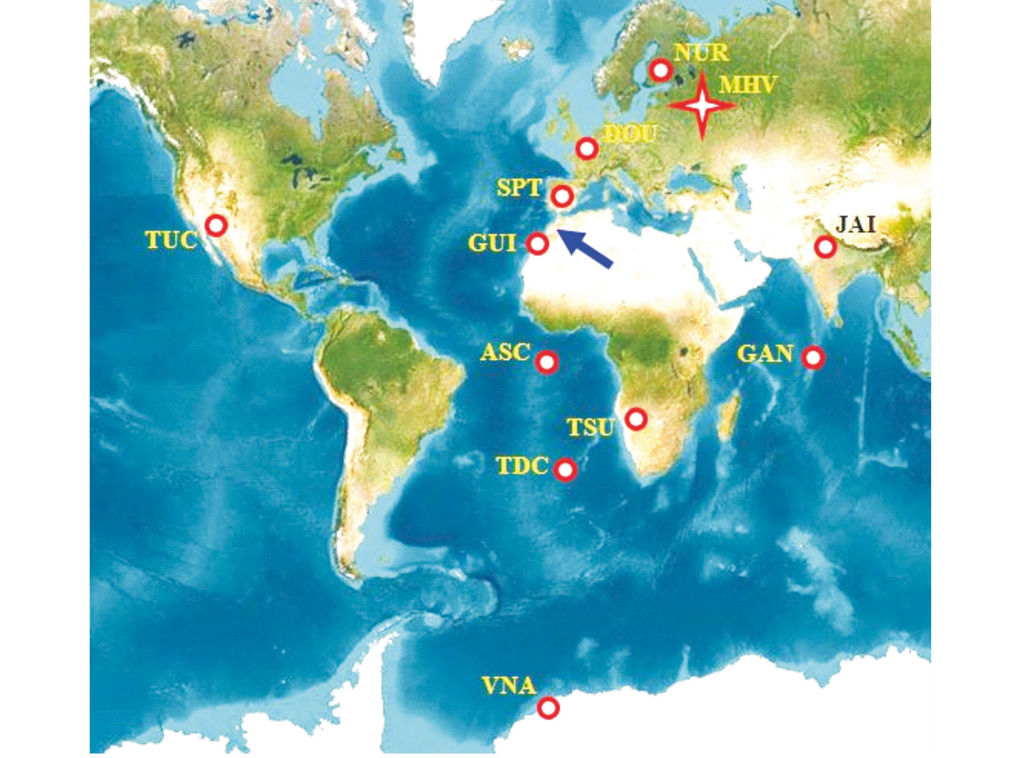 Рис. 1. Схема расположения очага землетрясения (синяя стрелка) и магнитных обсерваторий: кружки – обсерватории международной сети INTERMAGNET (коды обсерваторий приведены в поле рисунка), звездочка – обсерватория “Михнево” ИДГ РАН (MHV).