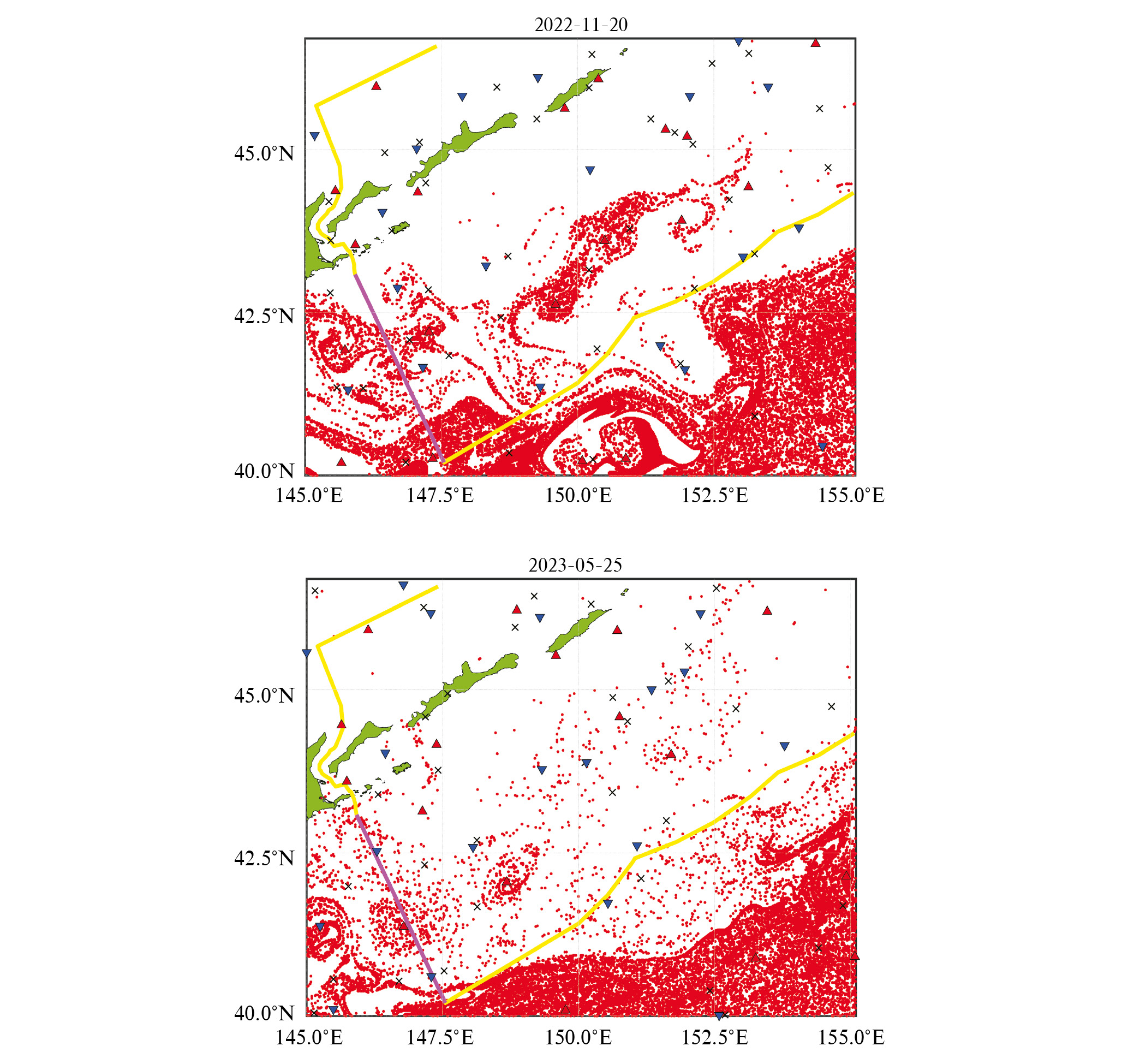 Каждые сутки в период с 24 августа 2022 г. по 24 августа 2023 г. прямоугольная область с координатами 40°–48,5° с. ш., 145°–159° в. д., включающая ЮКРЗ, засевалась пятном маркеров на равномерной сетке 500×500 узлов. Всего 25×104 маркеров. Далее для каждого маркера решалиcь уравнения адвекции в обратном времени на интервале 365 суток и рассчитывались траектории. Те маркеры, траектории которых в прошлом пересекли отрезок 35,6° с. ш., 141° в. д. – 38,2° с. ш., 141,6° в. д., расположенный параллельно береговой линии вблизи АЭС “Фукусима-1” (рис. 1), окрашивались красным цветом. Такие маркеры соответствуют потенциально загрязненным водам АЭС “Фукусима-1”. Хотя, как и утверждается многими экспертами, основная часть загрязненных вод действительно подхватывается потоком Куросио и уносится от берегов Японии в Тихий океан на восток, однако потенциально загрязненные частицы можно обнаружить вблизи Курильских берегов. На рис. 3 видно, что потенциально “грязные” маркеры достигают границ ЮКРЗ и переносятся далеко на север, а также через курильские проливы попадают в Охотское море. Отметим, что эти маркеры, как правило, часто концентрируются на периферии мезомасштабных вихрей или вдоль меандров, из чего следует, что вихревая адвекция является одним из механизмов, благодаря которому потенциально “грязные” маркеры могут достичь региона российского рыбного промысла.