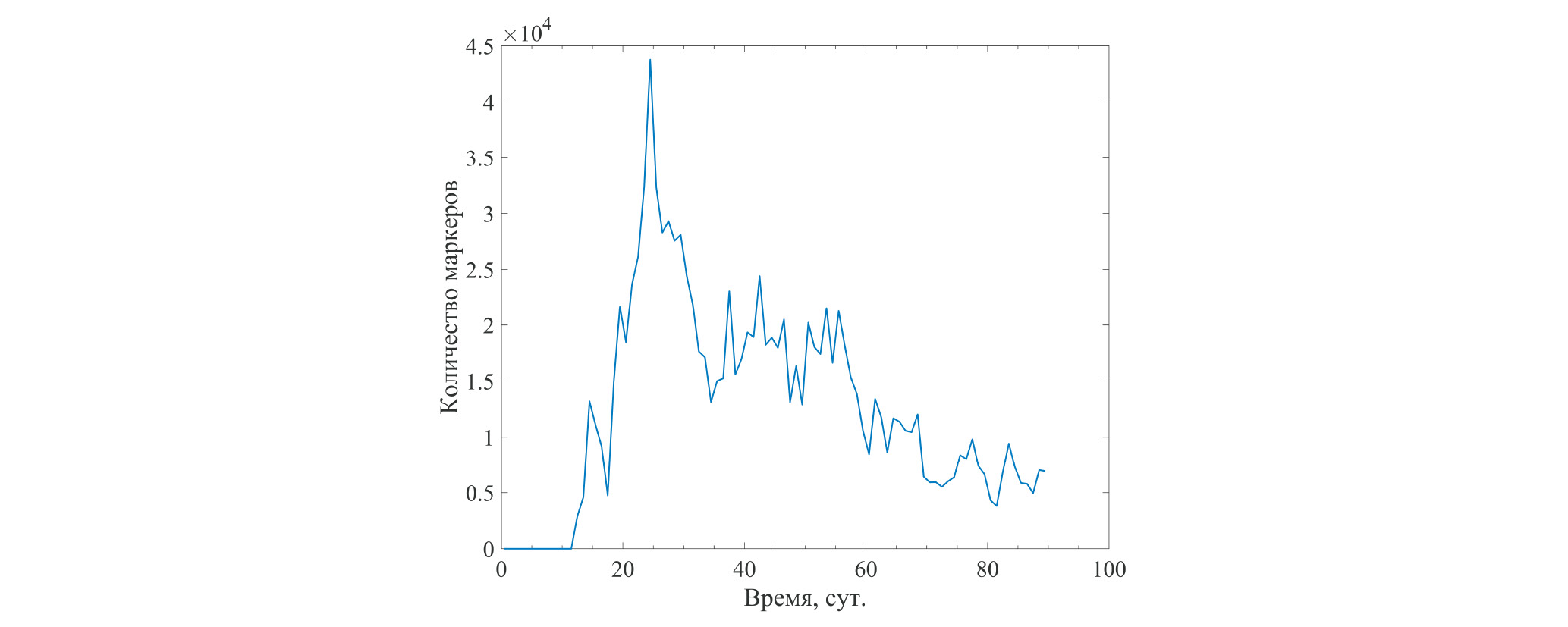 Рис. 4. Временная изменчивость количества “грязных” маркеров внутри ЮКРЗ. Счет проводился ежесуточно с 24 августа 2022 г. по 24 августа 2023 г. Траектория каждого маркера считалась в обратном отсчете времени на 1 год.