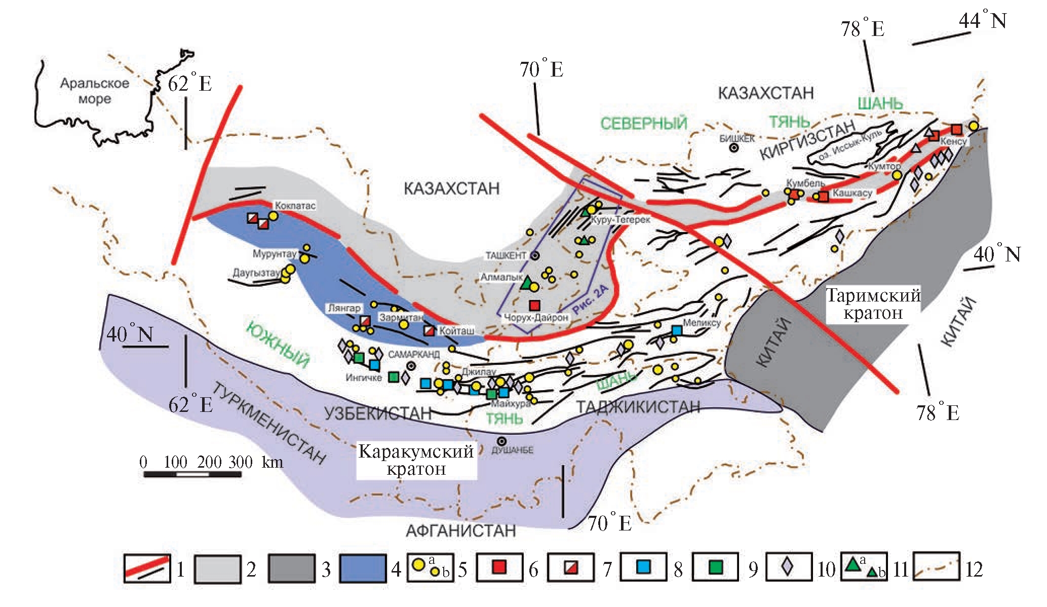 Рис. 1. Схема позднепалеозойского металлогенического пояса Тянь-Шаня. 1 – разломы разных порядков, 2 – позднепалеозойская активная континентальная окраина (Срединный Тянь-Шань), 3 – континентальные блоки основания Таримского и Каракумского кратонов, 4 – террейны аккреционного клина, надвинутые на пассивную континентальную окраину с возможным кратонным фундаментом, 5 – главные (а) и второстепенные (b) месторождения золота, 6 – золото-медно-молибден-вольфрамовые месторождения, 7 – молибден-вольфрамовые месторождения, 8 – полиметально-вольфрамовые месторождения, 9 – олово-вольфрамовые месторождения, 10 – месторождения олова, 11 – главные (а) и второстепенные (b) медно-молибденовые и золото-медные порфировые месторождения, 12 – государственные границы.