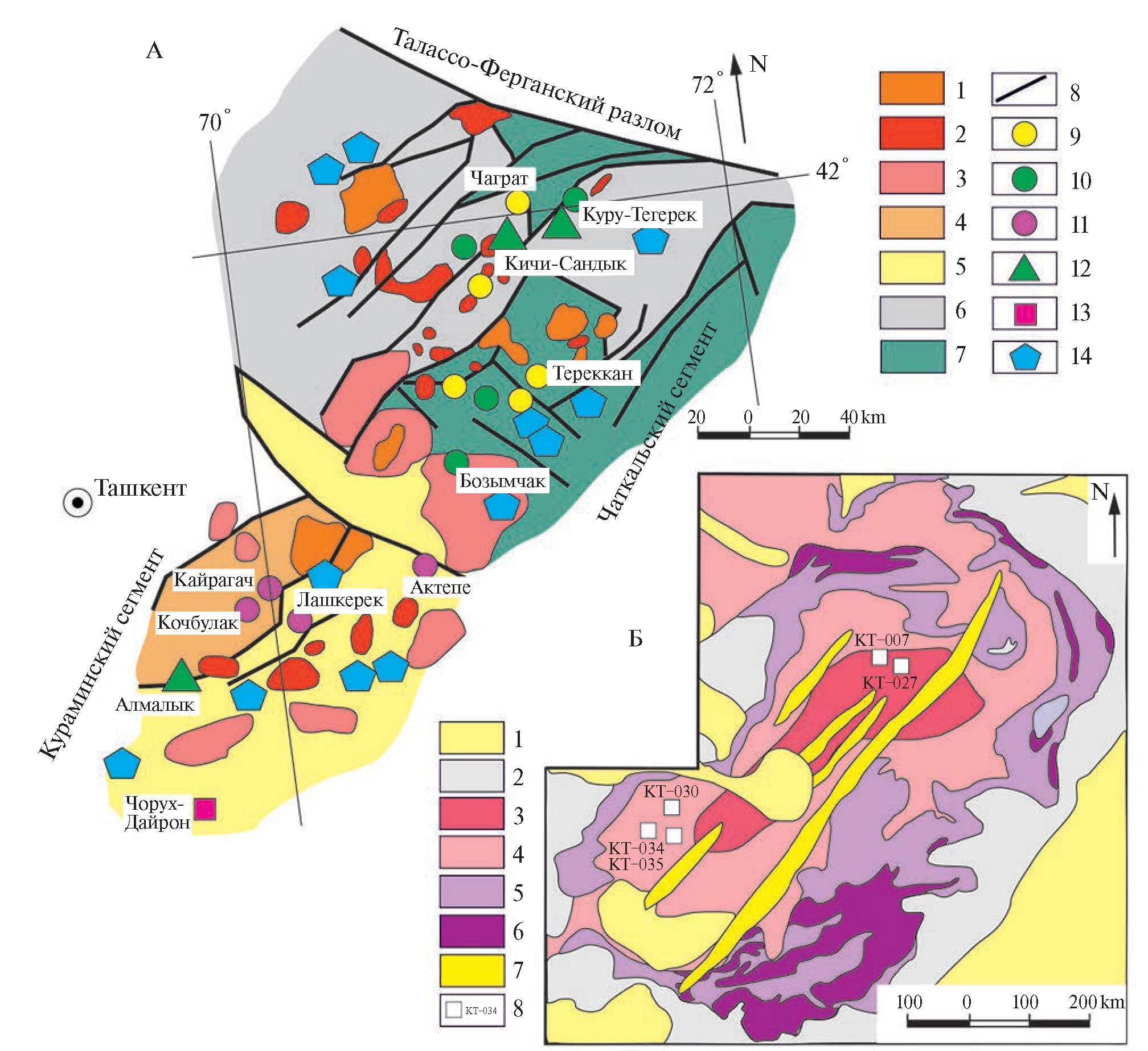 Рис. 2. Геологические схемы Чаткальского и Кураминского сегментов Срединного Тянь-Шаня (А) и месторождения Куру-Тегерек (Б) (по данным [8, 10, 12]). А: 1 – пермские гранитоиды, 2 – позднекаменноугольные гранитоиды (сандалашский комплекс в Чаткальском сегменте), 3 – ранне-позднекаменнноугольные гранитоиды, 4 – преимущественно кислые каменноугольные-пермские вулканиты, 5 – преимущественно основные каменноугольные-пермские вулканиты и угленосные молассы, 6 – девонские-каменноугольные известняки, доломиты, конгломераты, песчаники, 7 – силурийские и более древние карбонатные и кремнистые породы, 8 – разломы, 9 – месторождения золота, 10 – медно-золотые месторождения, 11 – эпитермальные серебро-золотые месторождения, 12 – молибден-золото-медно-порфировые месторождения, 13 – скарновые молибден-вольфрамовые месторождения, 14 – полиметаллические (Pb–Zn, Ag–U–Co–Ni–As и др.) месторождения. Б: 1 – кайнозойские отложения, 2 – нижнекаменногольные доломиты и известняки, 3 – тоналиты, 4 – габбро-диориты, 5 – скарны, 6 – рудные тела, 7 – зоны карбонат-филлизитовых метасоматитов, 8 ‒ места отбора проб для изотопного датирования цирконов.