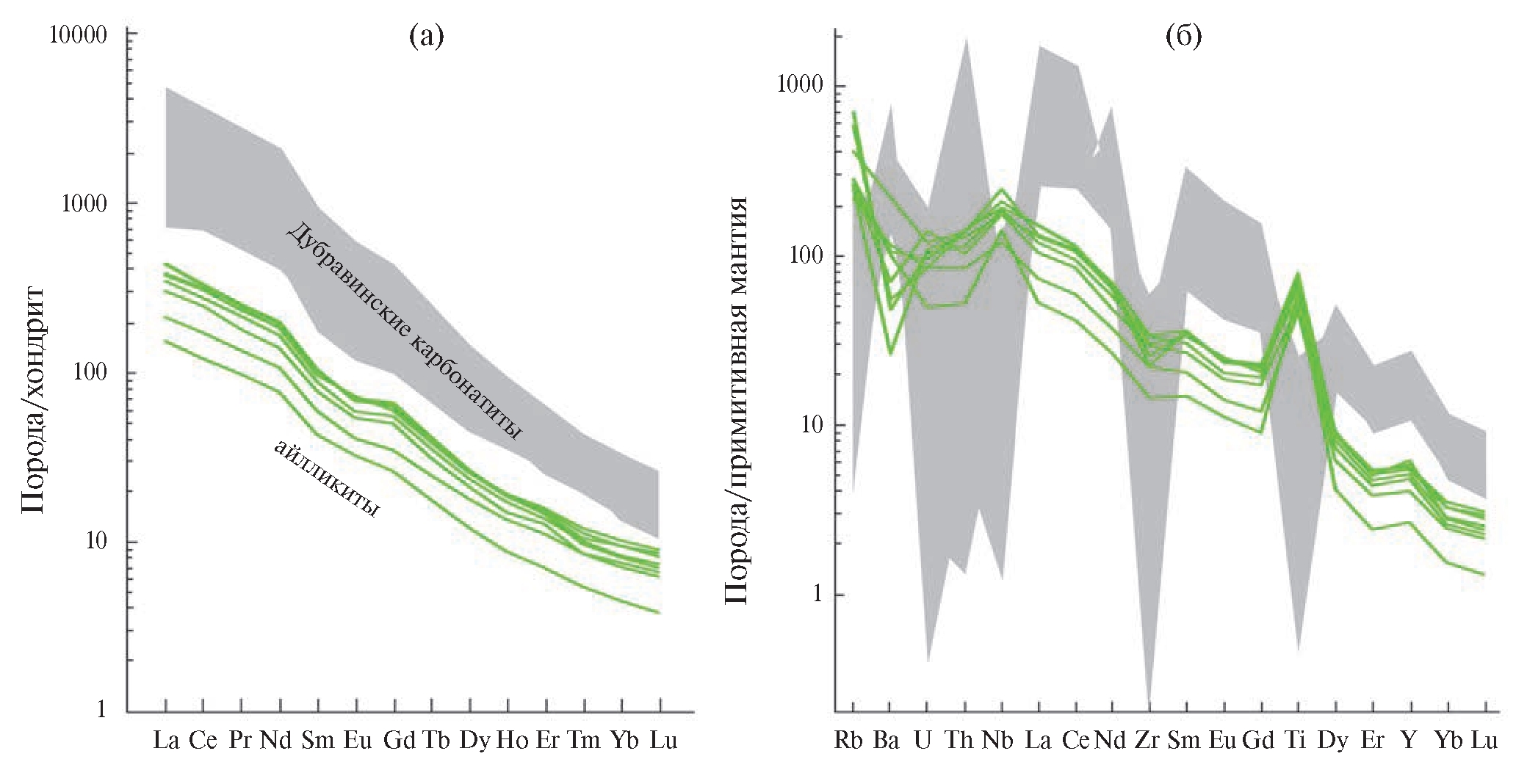 На глубинный, недавно метасоматизированный литосферный мантийный источник, в котором стабильны значительные количества флогопита и карбоната указывают: (1) близкий возраст карбонатитов дубравинского щёлочно-карбонатитового комплекса (2.07–2.08 млрд лет) и айлликитов; (2) пространственное положение – расстояние между проявлениями карбонатитов и дайками УМЛ 12–14 км, (3) одинаковый радиогенный изотопный состав Nd, (4) одинаковые значения отношения (Gd/Yb)n и распределение РЗЭ при разных уровнях концентраций (рис. 3 а). В сравнении с карбонатитами, айлликитовые расплавы, по-видимому, представляют более высокие степени плавления обогащённого мантийного источника, о чём свидетельствуют более высокие концентрации MgO, Ni, Cr и низкие P2O5, Sr, Ba, LREE по сравнению с дубравинскими карбонатитами.