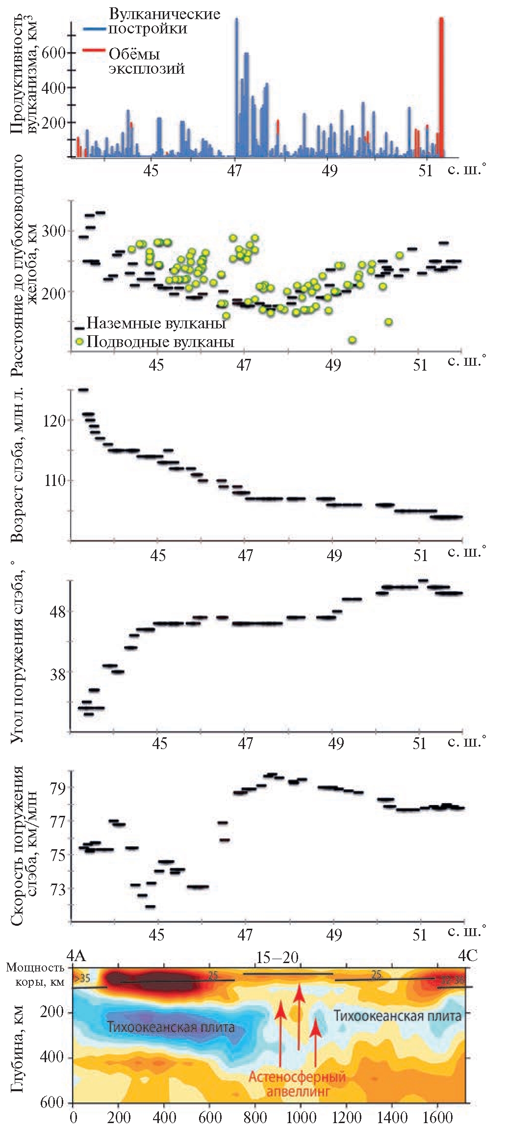 Для решения выявленной проблемы были использованы результаты предыдущих исследований. Анализ сейсмической активности вкрест простирания зоны субдукции проводился на основе данных Сахалинского филиала геофизической службы Российской Академии наук (рис. 2). Характер отношений слэба и мантии изучался с помощью мантийной томографии (рис. 3). Геофизические характеристики слэба вдоль дуги представлены с публикации [8]. Пространственное проявление вулканизма, в том числе расстояние до глубоководного желоба, объёмы продуктов извержений были проанализированы из компиляции многочисленных источников [2, 9, 10] (рис. 4).