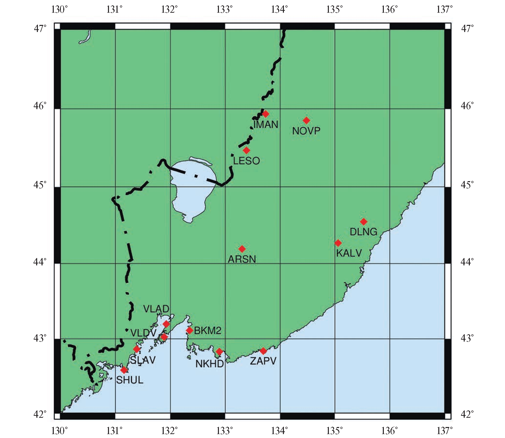 При анализе мы использовали данные Глобальных навигационных спутниковых систем, полученных с помощью спутниковых систем ГЛОНАСС (24 спутника на высотах 18840–19440 км) и GPS (32 спутника на высоте около 20150 км) по следующим наземным ГНСС-станциям, расположенным в Приморском крае: ARSN, BKM2, DLNG, IMAN, KALV, LESO, NKHD, NOVP, SHUL, SLAV, VLAD, VLDV, ZAPV (рис. 1). Часть используемых станций входит в комплексную геодинамических сеть ДВО РАН [6]. Частота дискретизации ГНСС-данных равна 0.033(3) Гц. Определение величины полного электронного содержания выполнялось по методу, описанному работах [7, 8], точность определения ПЭС составляет по фазовым измерениям составляет около 0.01–0.02 TECU [9].