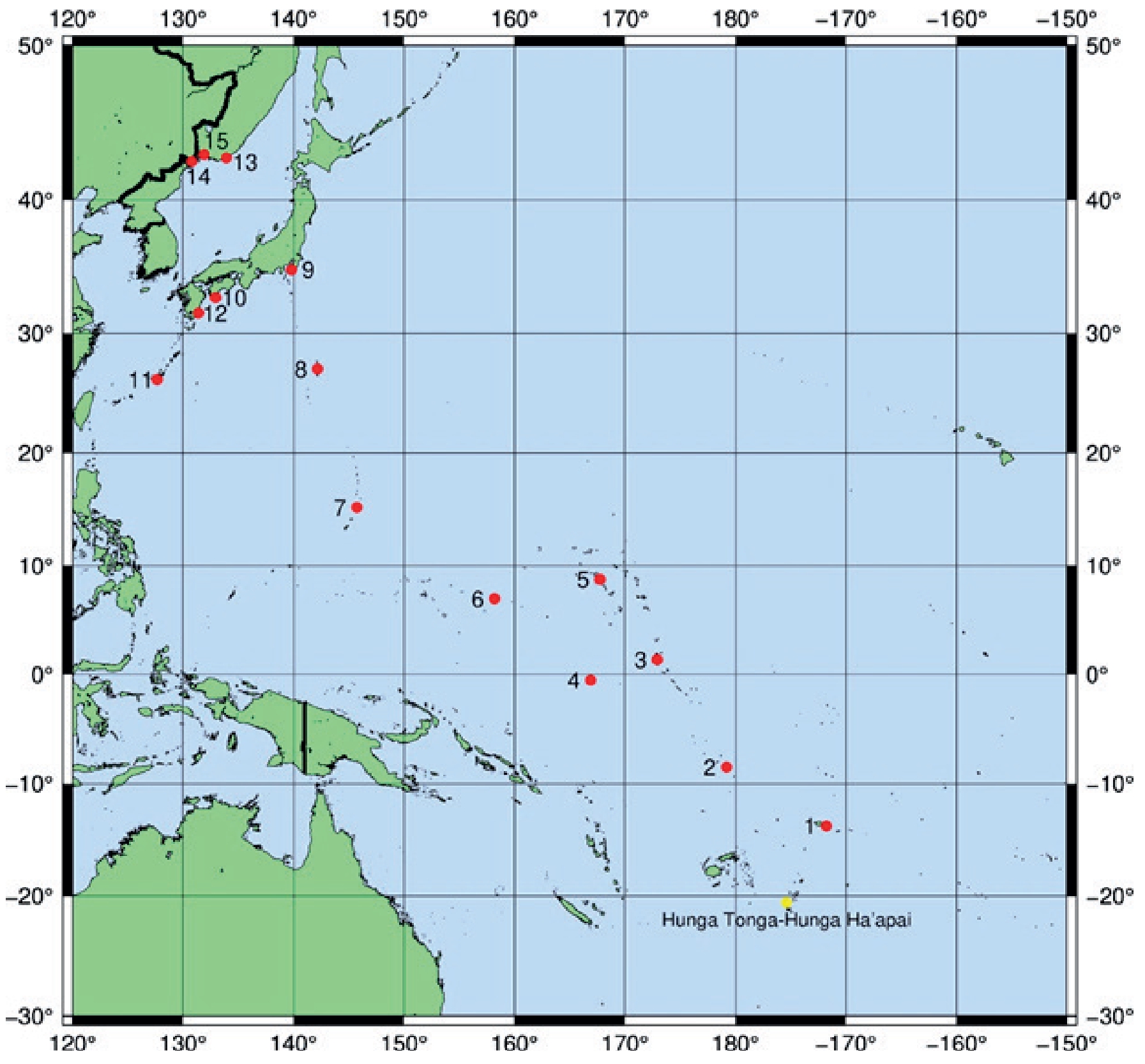 Рис. 4. 1–12 – Станции, расположенные в Тихом океане. Красными кружками показано положение уровнемерных станций, желтым кружком – положение вулкана.