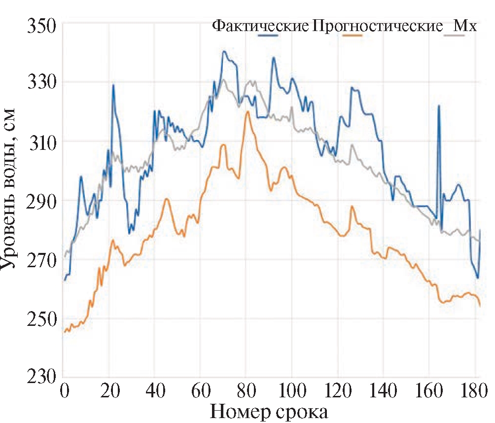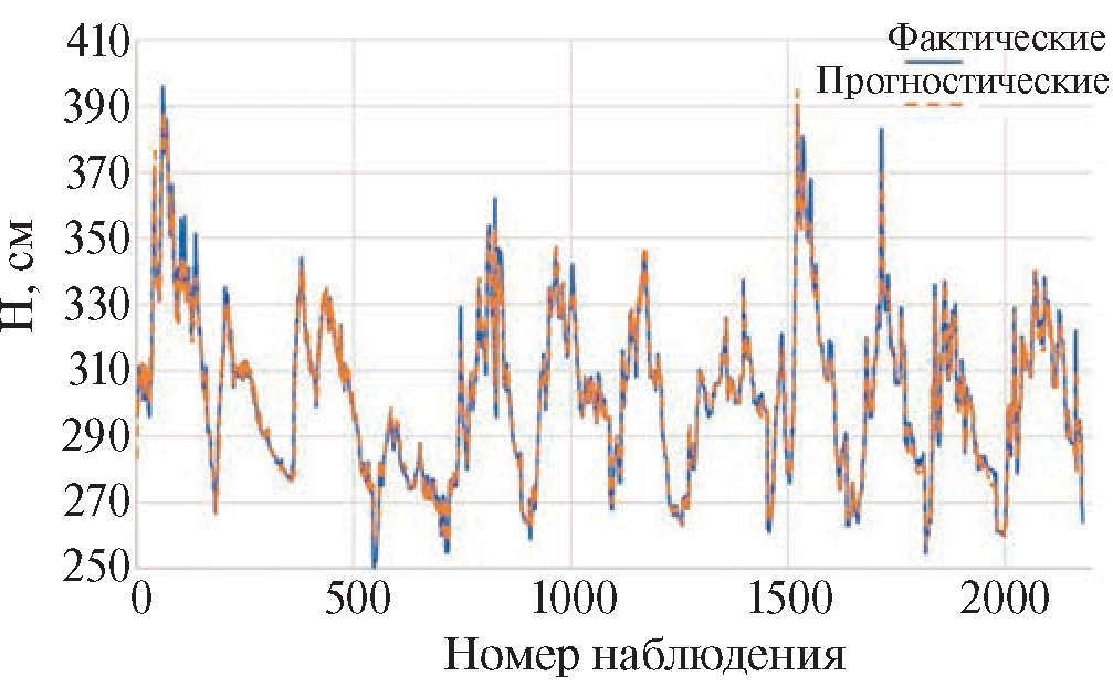 Рис. 3. Сравнение фактических и прогностических уровней воды с заблаговременностью один сезон при использовании модели АРПСС.