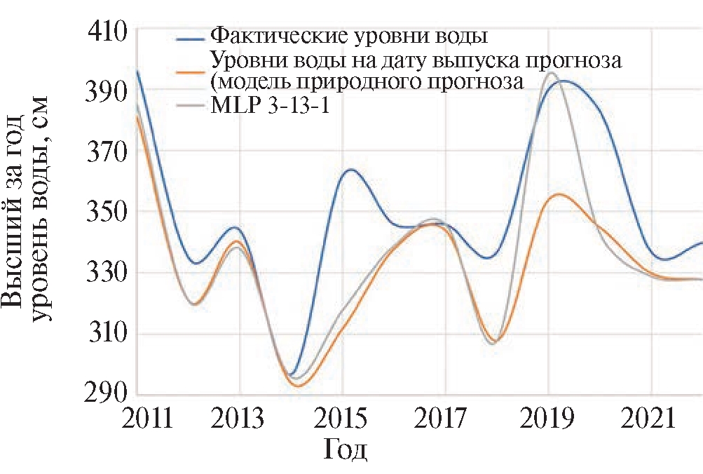 Для оценки качества прогнозирования высших уровней воды (рис. 5) за год необходимо выбрать высшие уровни воды за год, рассчитать среднее их значение и стандартное отклонение, а также среднее изменение за период заблаговременности. Можно отметить, что среднее значение высших за год уровней воды составляет 351 см, а стандартное отклонение от среднего 28 см, средне изменение за период заблаговременности (24 часа) составило 15 см, стандартная ошибка модели при прогнозировании высших уровней воды — 20 см, (модель природного прогноза для высших уровней воды имеет стандартную ошибку, равную 25 см). Таким образом, можно рассчитать отношение S/σ и S/σΔ, которые равны 0.71 и 1.33. Модель эффективно прогнозирует высшие уровни воды по сравнению с ориентированием на их среднее значение и моделью природного прогноза, но неэффективна по сравнению с ориентированием на среднее изменение уровня за период заблаговременности. Однако надо учитывать, что прогноз по модели выпускается непрерывно, а для ориентирования на среднее изменение уровня за период заблаговременности необходимо определить дату выпуска прогноза, что ввиду отсутствия маркеров невозможно (заранее неизвестно, через какое время сформируется высший уровень воды), поэтому критерий S/σΔ является фиктивным и не может свидетельствовать об эффективности подобных методик при их использовании для прогнозирования экстремальных значений величин.
