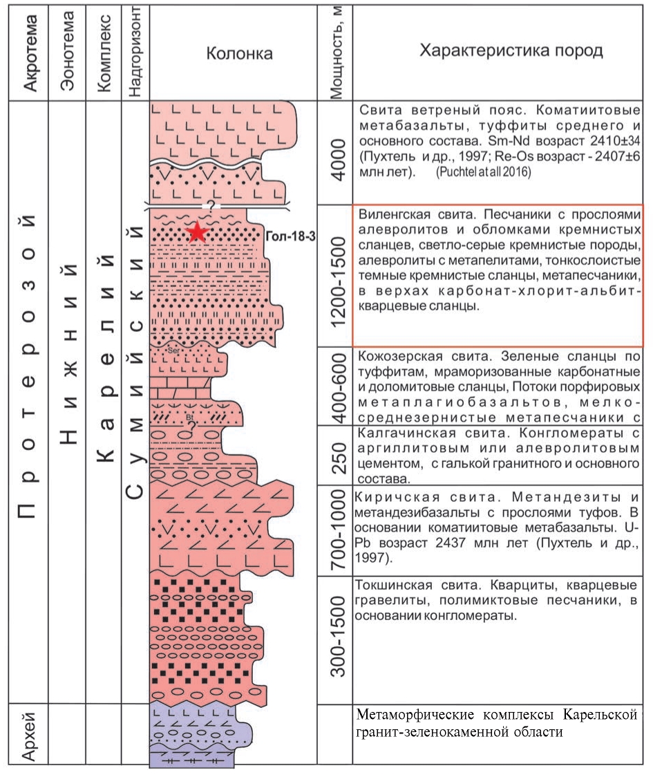 Рис. 1. Сводный разрез Ветреного пояса по [2] с дополнениями. Звёздочкой показано местоположение изученных метапесчаников.