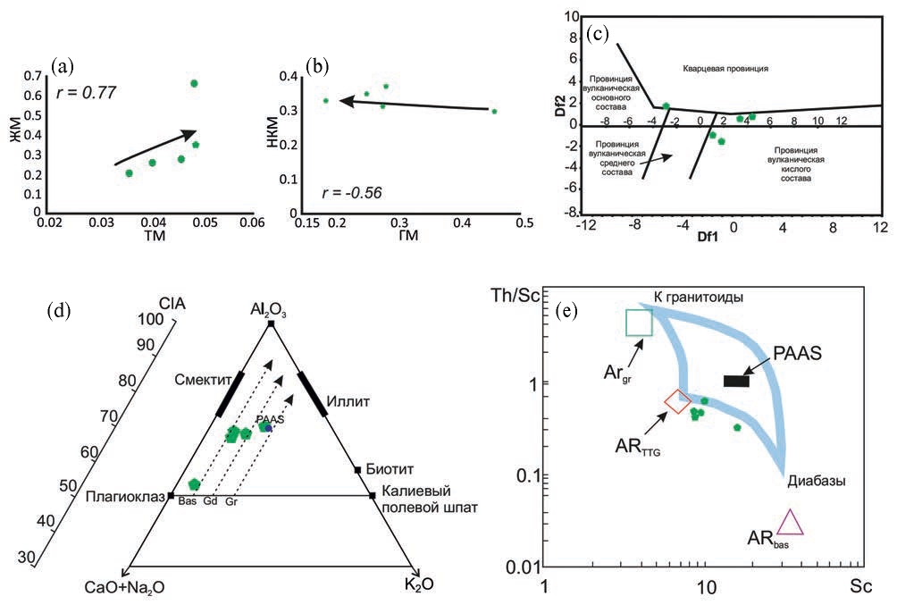 Рис. 2. Точки составов метапесчаников виленгской свиты на диаграммах: a – ТМ-ЖМ; b – ГМ-НКМ; c – Df1–Df2 [8]; d – (CaO+Na2O)–Al2O3–K2O [9]; e – Sc–Th/Sc [10].