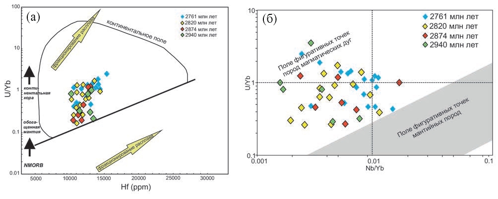 Отношение (Yb/Gd)N в цирконе составляет 7–15. На дискриминационной диаграмме U/Yb–Hf [12] все фигуративные точки расположены в континентальном поле, а на диаграмме Nb/Yb–U/Yb точки составов расположены между полем пород океанической коры и полем магматических дуг (рис. 4). Отношение U/Yb в цирконе находится в интервале 0.2–2.5, в среднем составляет 0.8–1, что характерно для магматических дуг сформированных на континентальной коре.