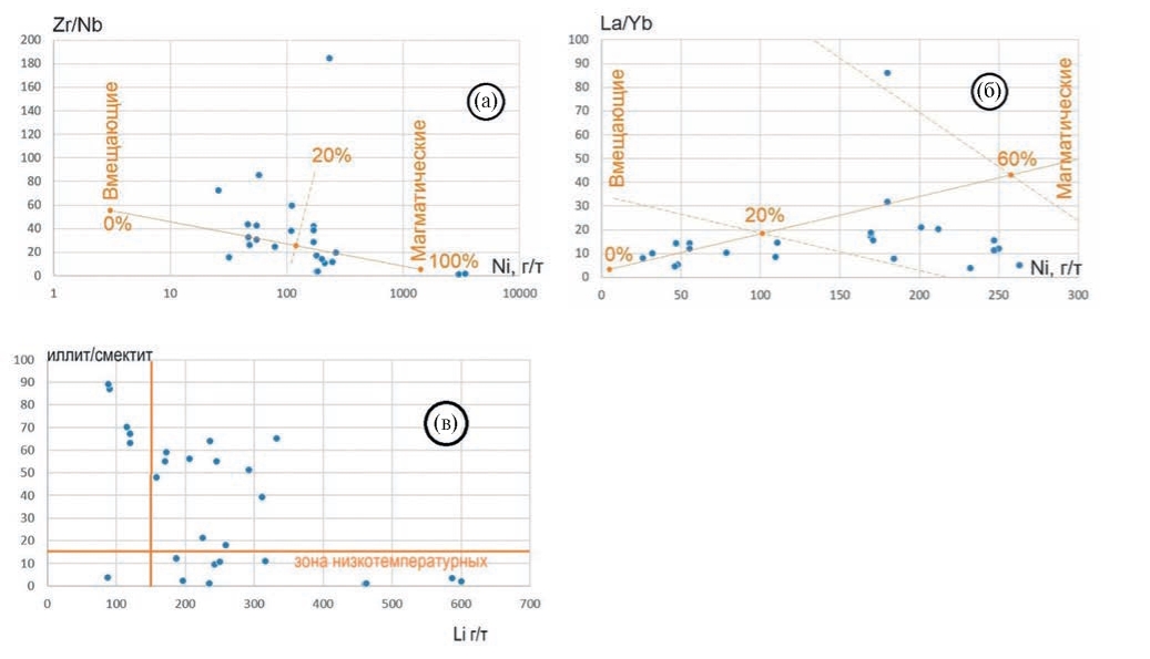 В тонкодисперсной фракции исследованных образцов, в которых преобладают минералы со структурными неоднородностями (типа смектит-гидрослюдистый ССМ) по концентрации главных и редких элементов Ni, La, Zr, Nb, Yb процент магматического материала в редких исключениях превышает 60 мас. % (рис. 5). Значительные концентрации лёгких редкоземельных элементов (La, Nd), флюидно-подвижных элементов (Li, As, S, Sr) и других несовместимых элементов (Zr до 850, Nb до 75 г/т) позволяют предположить, что глины образовались благодаря взаимодействию горячих гидротермальных флюидов (до 400°С), богатых кремнием и холодных метеорных (возможно, морских) вод [12]. Это выражается в соотношении гидрослюдистого компонента к смектитовому менее 15 и концентрации лития более 150 г/т (рис. 5 в). Вероятно, самостоятельная гидрослюда 1M обусловлена в основном деградацией флогопита из-за выноса двухвалентных металлов, поэтому наследует свойственный ему политип 1M. Разнообразие слоистых силикатов обусловлено тем, что в результате постмагматических процессов, флюиды, поступившие по кимберлитовым конгломератам и карбонатным трещинам ордовикского кимберлитовмещающего цоколя, преобразовывали смектиты в гидрослюды. С процессами выветривания связаны структурные неоднородности типа каолинит-монтмориллонитового ССМ.