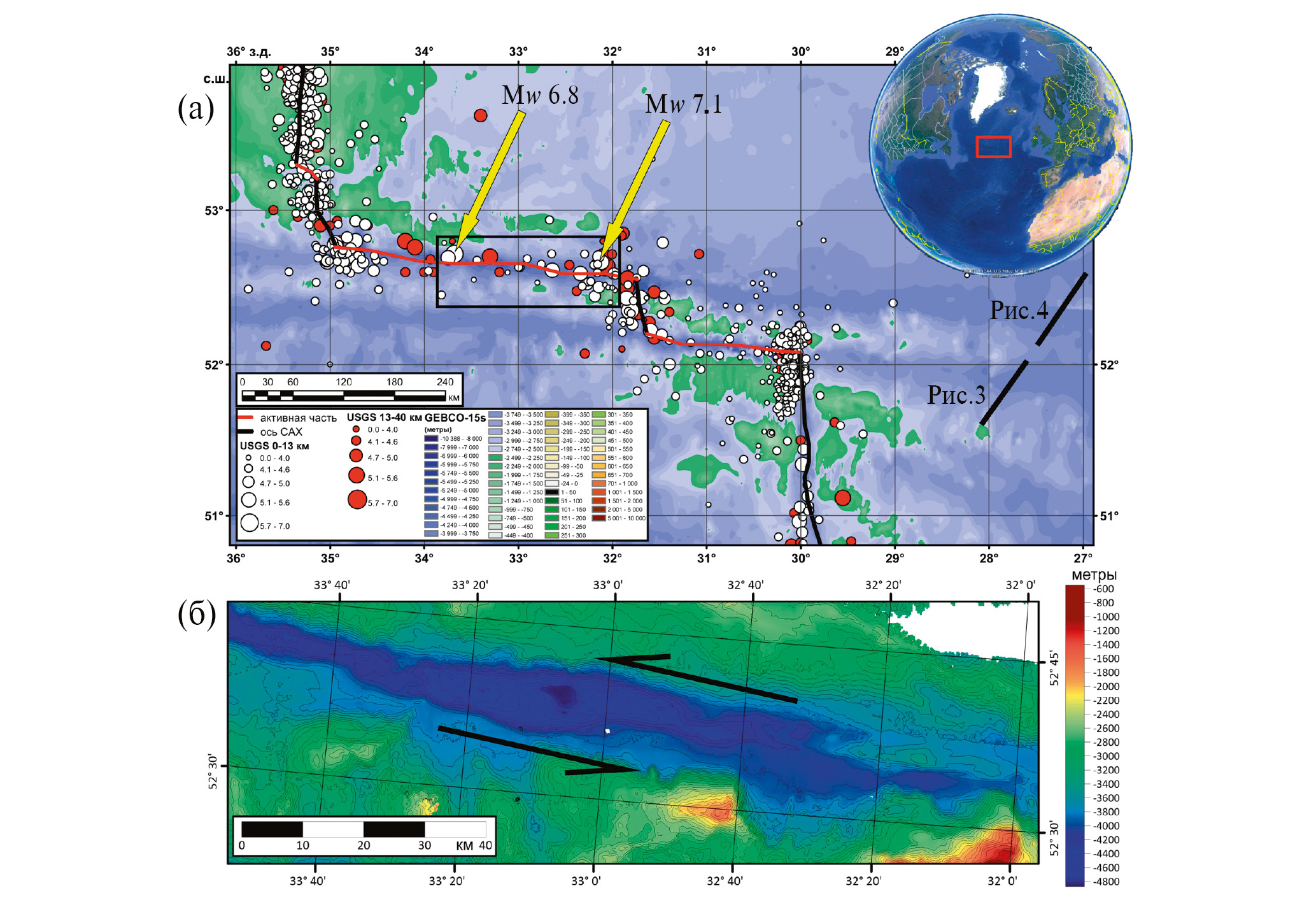 Рис. 1. Район сдвоенного трансформного разлома Чарли Гиббс. (a) – сейсмичность по данным [1, 2], рельеф дна по данным [3], положения разрезов рис. 3 и рис. 4, на врезке общее положение района исследований в Северной Атлантике, прямоугольником показано положение планшета рис. 1 б с детальным рельефом; (б) – левосдвиговая впадина пулл-апарт по данным многолучевой батиметрии 50-го рейса НИС “Академик Николай Страхов” (ГИН РАН, 2020) на оси северного трансформного трога.